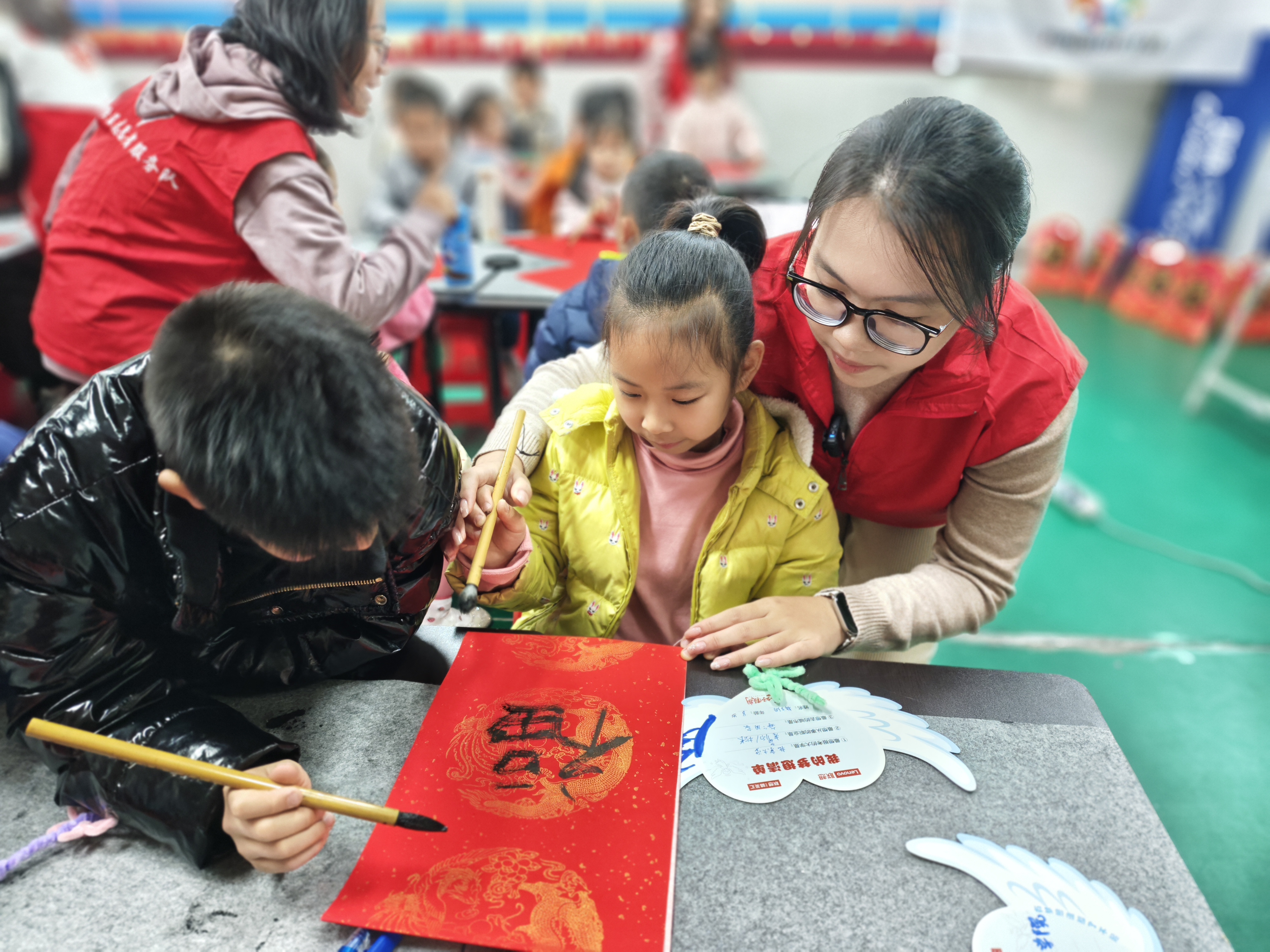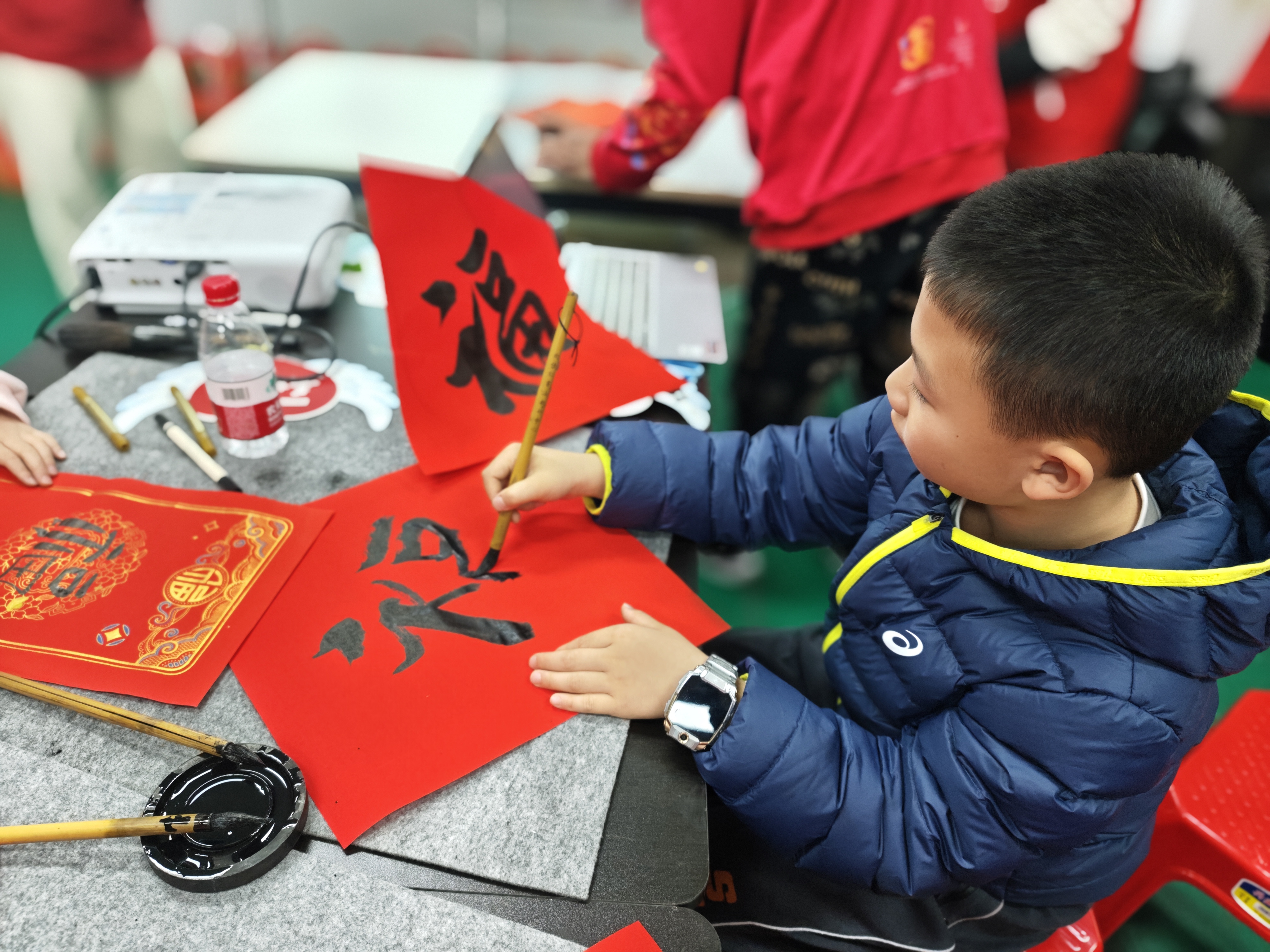 中午,快到“放学”时间,6岁的利鑫看到来接自己的妈妈,高高举起刚写好的“福”字斗方,兴奋地朝坐在课室后排的妈妈用力挥舞着小手。