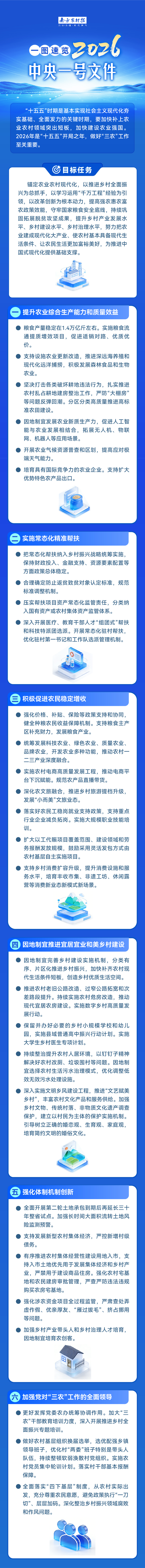 2月3日,党的十八大以来第14个指导“三农”工作的中央一号文件重磅发布。文件指出,2026年是“十五五”开局之年,做好“三农”工作至关重要。进入新阶段,中央作出哪些重要部署?农业农村农民将迎来哪些利好?南方农村报记者带你一图速览文件要点。