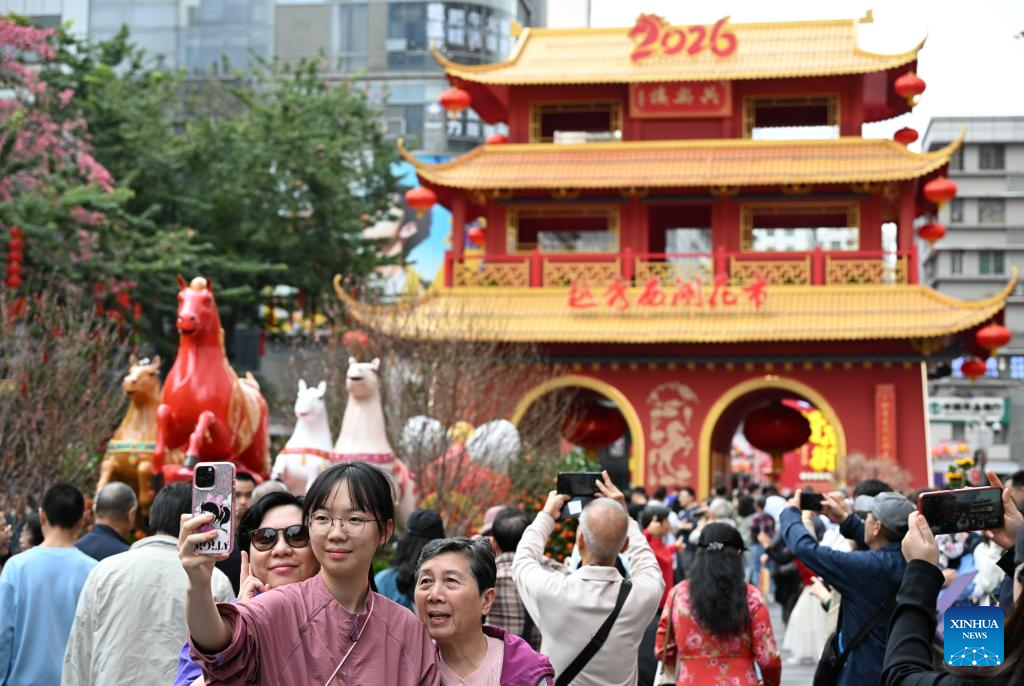 People pose for a selfie at a flower market in Yuexiu District, Guangzhou, south China's Guangdong Province, Feb. 15, 2026. China is alive with vibrant celebrations with the Spring Festival just around the corner. (Xinhua/Deng Hua)