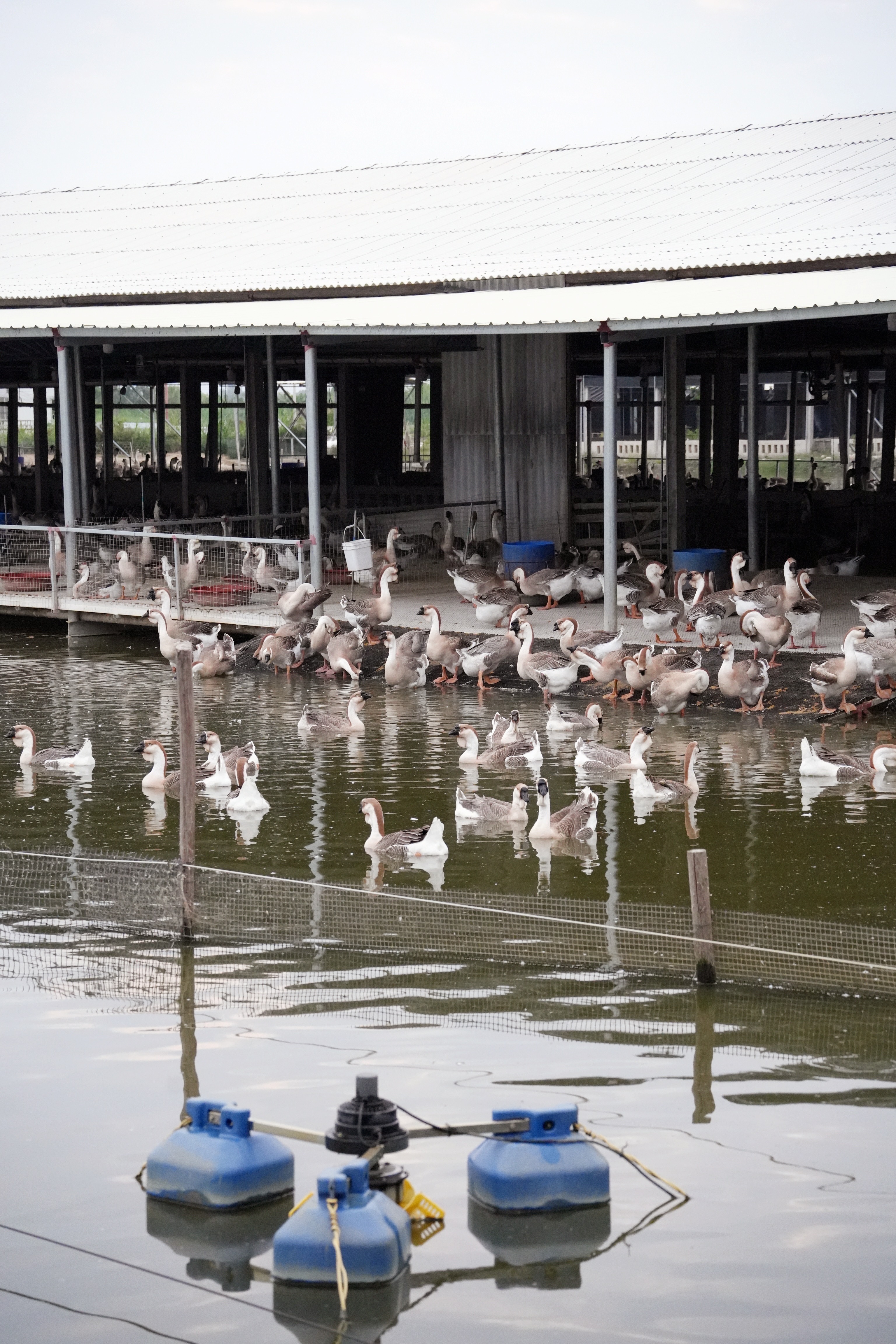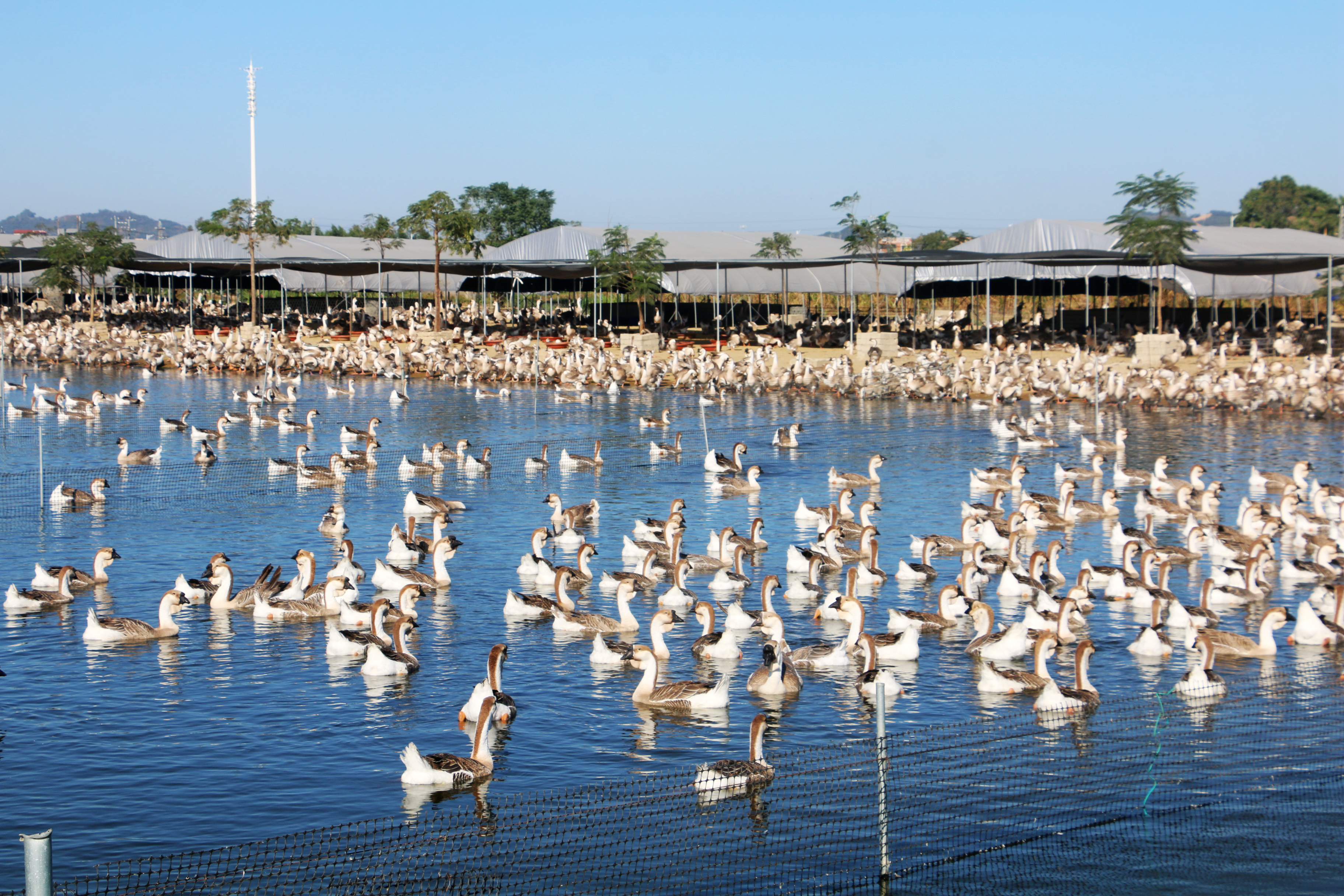 标准化的养殖场里,狮头鹅群或在水中嬉戏、或在棚边休憩。