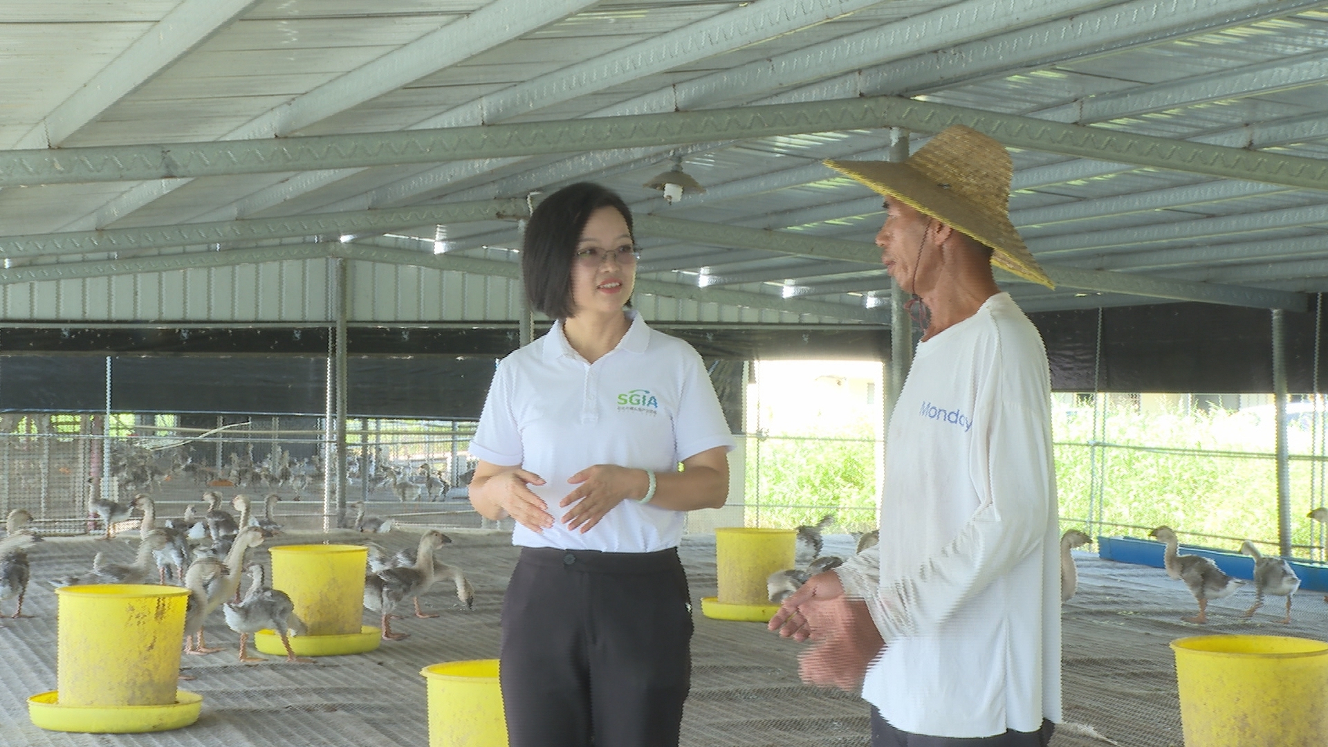汕头市狮头鹅产业协会秘书长邱丽君(左)走进鹅棚,与鹅农交流养殖情况。