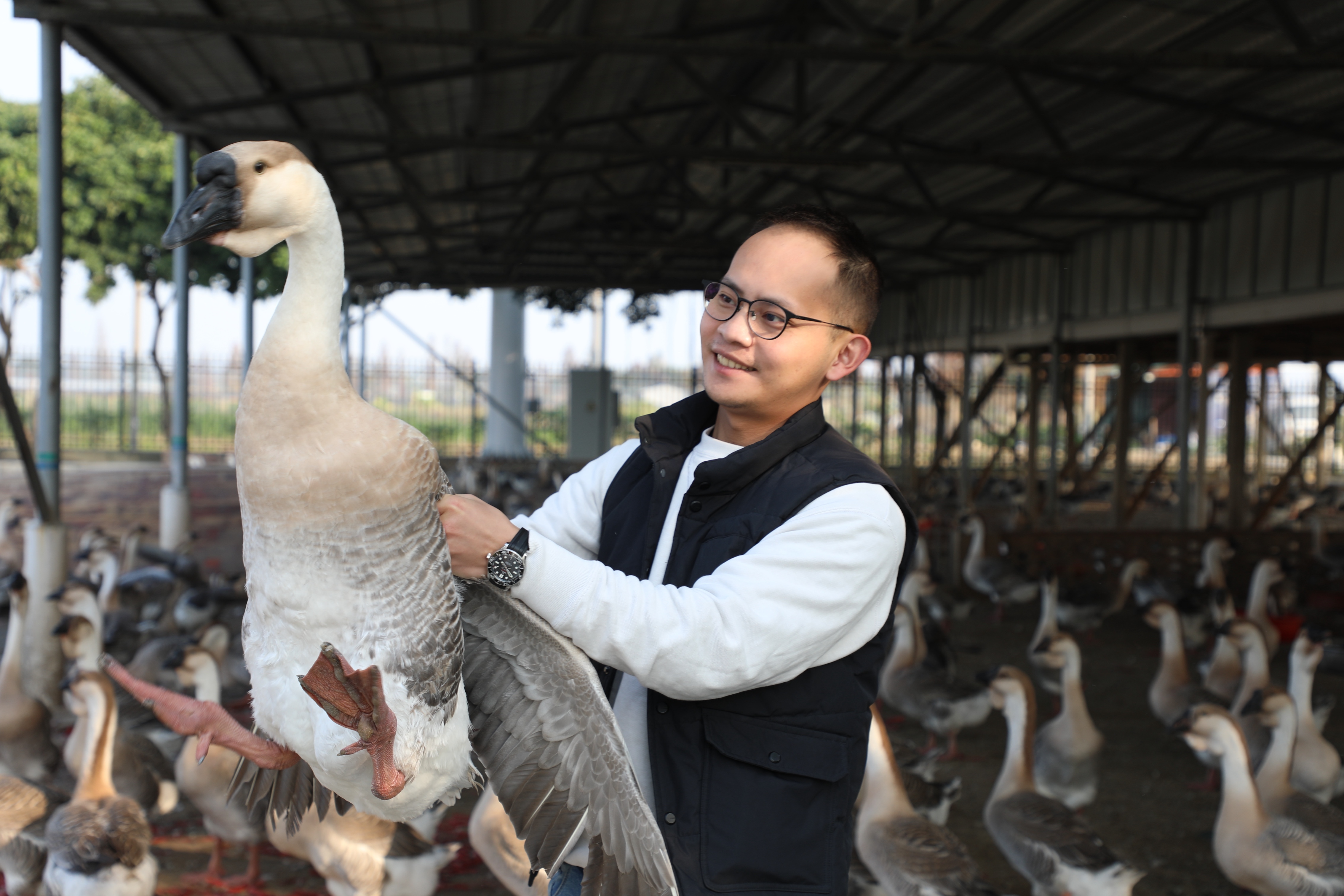 他立刻换上胶靴、草帽,一头扎进鹅棚,跟着父亲学选种、跟老师傅学手艺,手掌很快磨出了和父辈一样粗糙的茧。