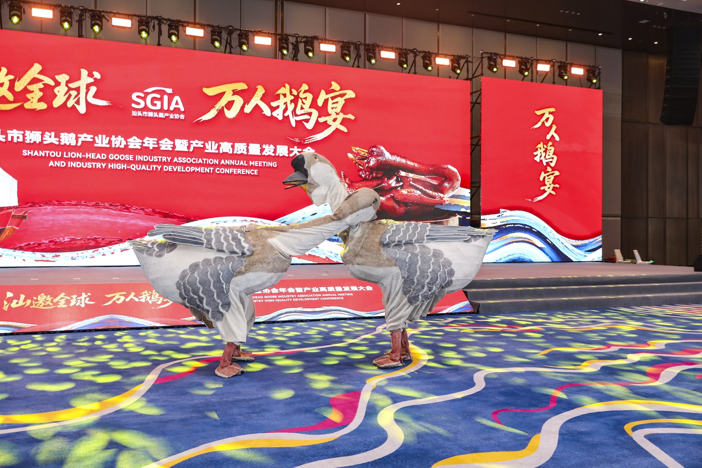 舞台上,双咬鹅舞的舞者操控狮头鹅道具,还原引颈互动的生动姿态。