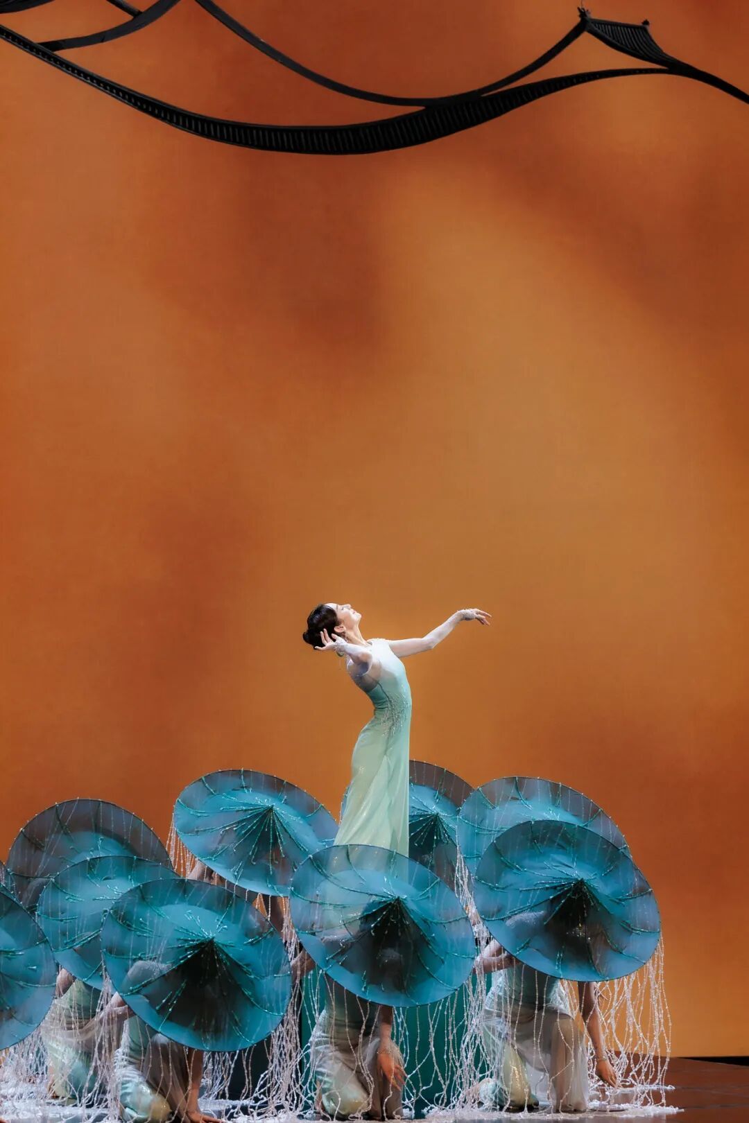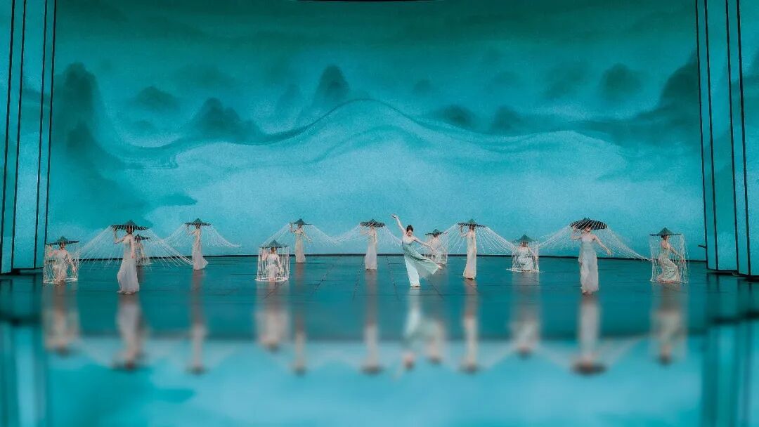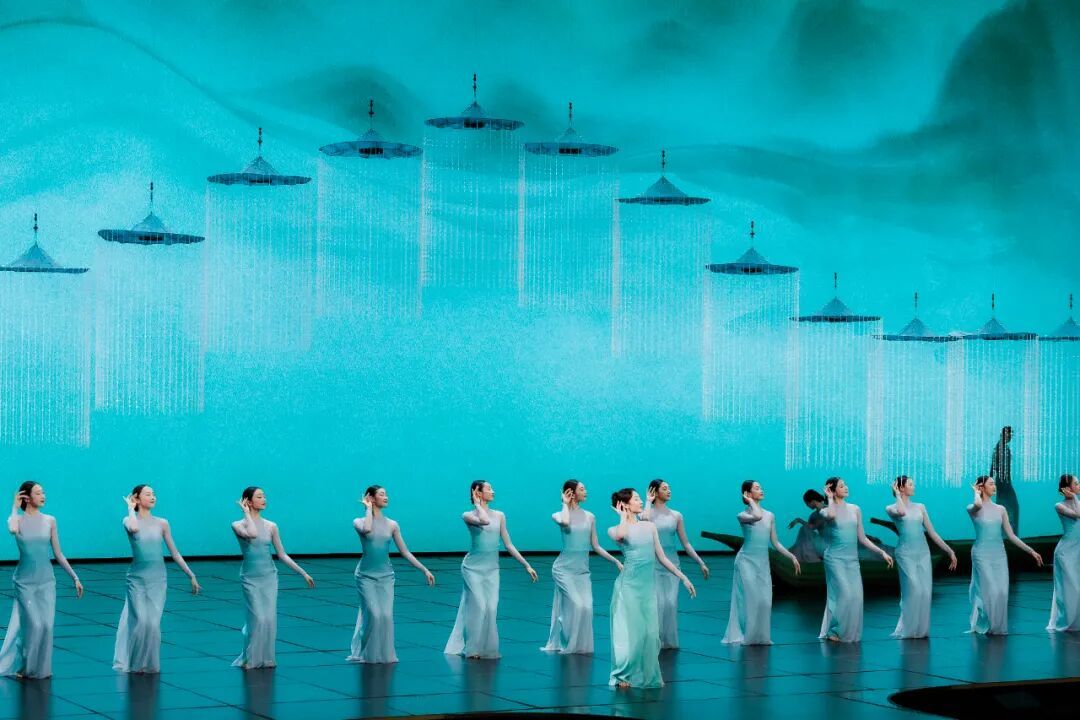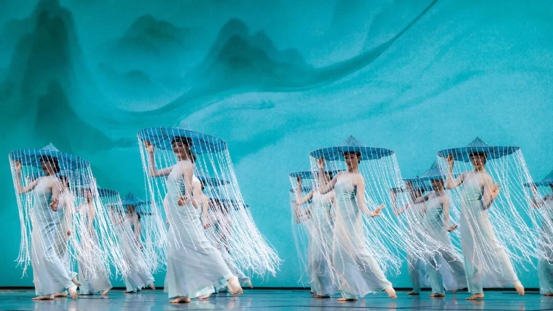 为了将这份诗意搬上舞台,舞蹈选用了一只看似简单却耗时几个月打磨出的道具——缀满珠帘的斗笠。斗笠是江南烟雨中常见的物件,导演组在斗笠边沿垂下一圈珠帘,营造出“雨滴凝固”的效果。舞者倾斜身体,珠帘便如斜风细雨般倾泻;舞者旋转起舞,珠帘如瓢泼大雨般飞扬;舞者上下跳跃,珠帘落地便有了苏轼诗中“白雨跳珠乱入船”的妙感。