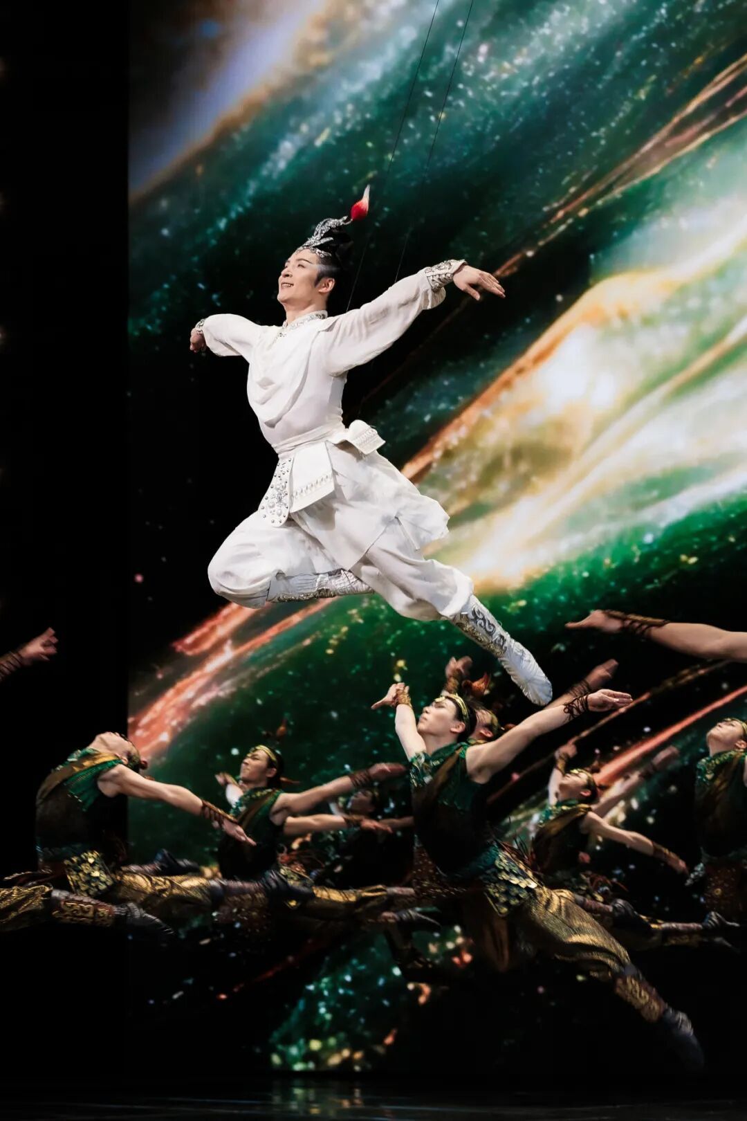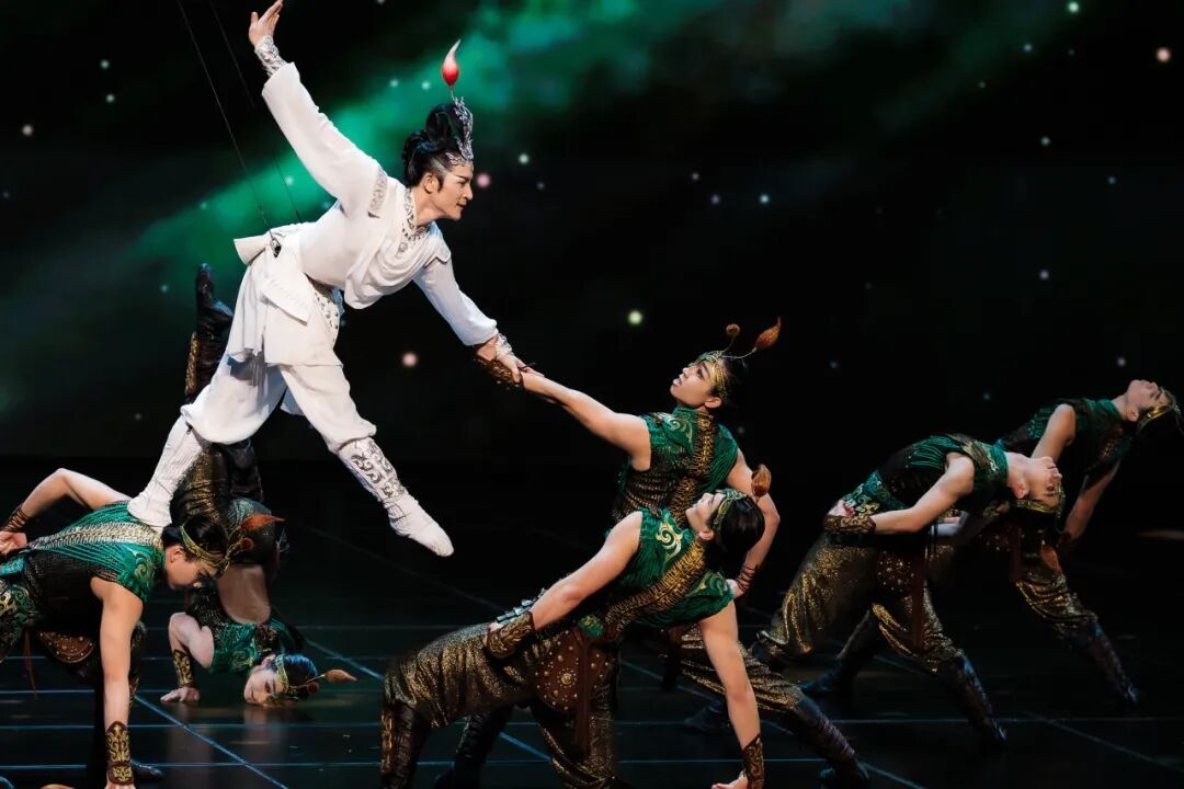 而真正让这份“精神”得以腾空、形成视觉冲击力的,是威亚技术与舞蹈语言的深度融合。导演组启用了威亚系统,不同于龙年《锦鲤》使用的数控威亚,演员蹬地弹跳展现少女的轻盈跃动,《追影》要体现男子的力量感,完成大量的承托、推送、翻腾等复杂动作,必须改用力量控制感更好的人力威亚。
