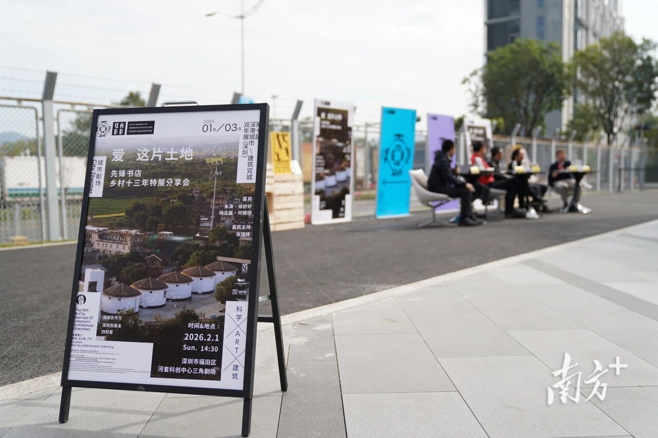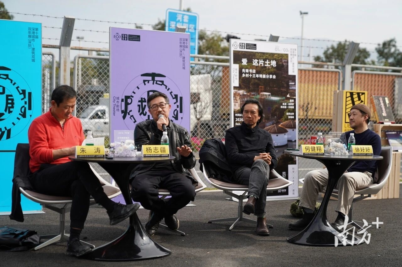 “先锋书店乡村十三年”展览日前在深圳市福田区河套科创中心举行。展览期间,深港双年展总策展人朱涛,“先锋书店乡村十三年”策展人徐好好和建筑师杨志疆、何健翔,齐聚双年展户外的三角剧场,展开“在城望乡,深港边界上的一次先锋对话”,围绕先锋乡村书店项目、乡村与乡村建设等话题进行讨论。