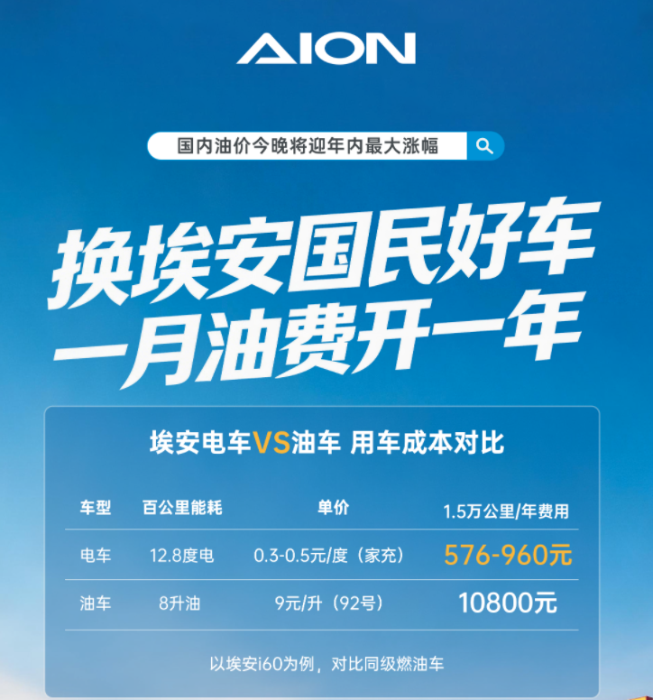这种趋势已经得到验证,新能源赛道中,新能源汽车龙头股比亚迪上涨5.69%,盘中涨超8%,市值一度站上万亿关口,新日股份、爱玛科技等电动两轮车概念股涨停。不少车企也迅速回应,广汽埃安贴出用车成本对比,直呼“一月油费开一年”。