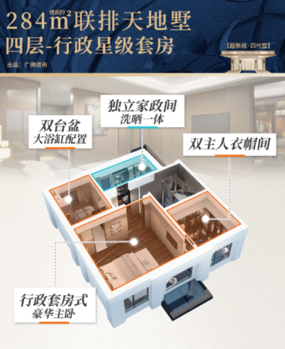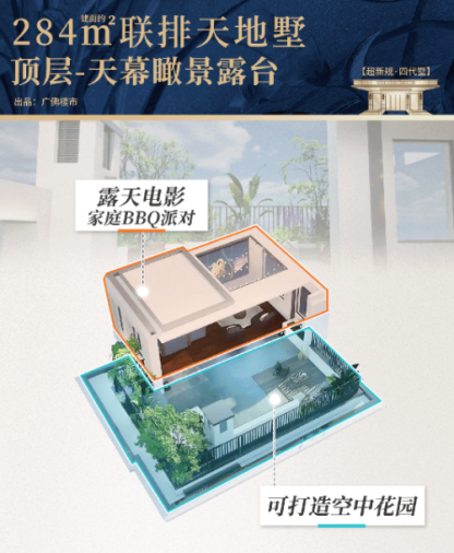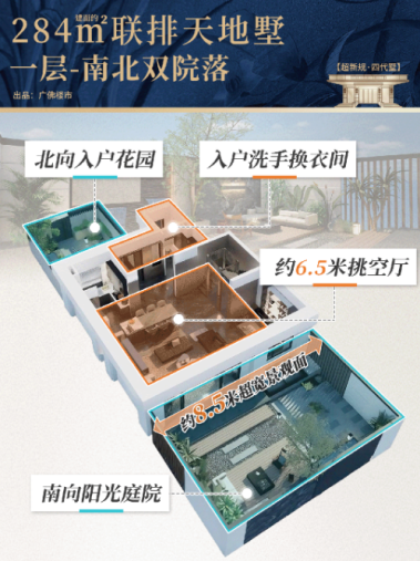 在空间尺度打造上,“超新规四代墅”实现了多重突破。其中,一亩院大平墅配备约120平方米的前庭后院,搭配约6.5米挑空墅厅,构建出“室内外交融”的社交空间;约17米的巨幕采光面,进一步提升了空间的通透感与开阔度。而联排天地墅则采用“垂直分层”设计,1层作为社交会客区,2层规划为长辈休憩空间,3层设置儿童套房,4层为奢阔主套,顶层配置空中花园,通过清晰的代际分层逻辑,满足高端改善家庭对“自由与亲密兼具”的居住需求,为城市墅居生活提供了新可能。