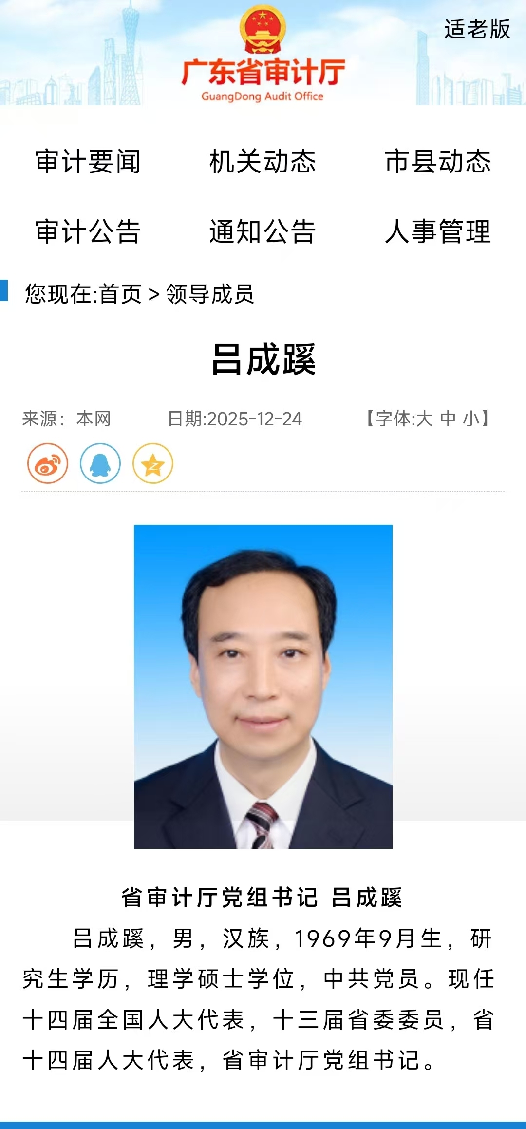 广东省审计厅官网信息显示,吕成蹊已任广东省审计厅党组书记。官网资料显示:吕成蹊,男,汉族,1969年9月生,研究生学历,理学硕士学位,中共党员。现任十四届全国人大代表,十三届省委委员,省十四届人大代表,省审计厅党组书记。南方+记者 李凤祥 南方日报、南方+客户端原创,未经授权不得转载 编辑 王露纯 周煦钊校对 钟惠玲 订阅后可查看全文(剩余80%)