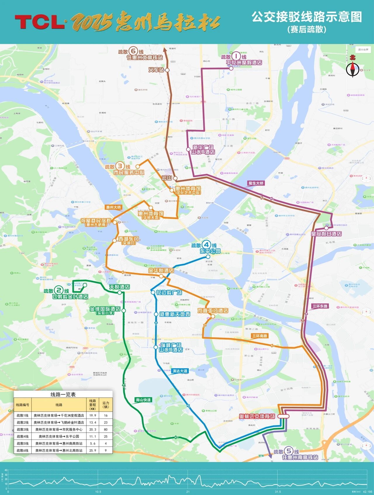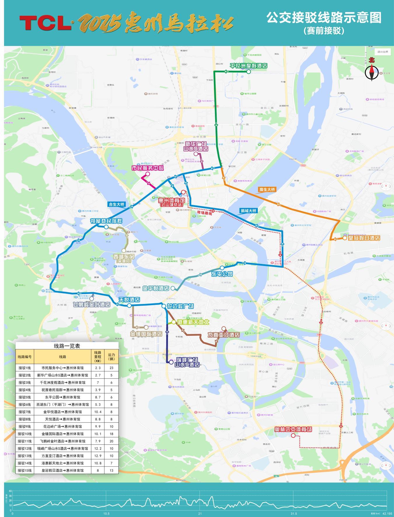 (一)12月28日赛事当天5时30分至6时30分,在市区江北、江南、桥东、桥西、龙丰、河南岸、水口七个片区设置15条公交接驳专线(车辆贴有统一标识),中途不停靠,一站直达起点惠州体育馆(云山城轨站)。(详见图3)