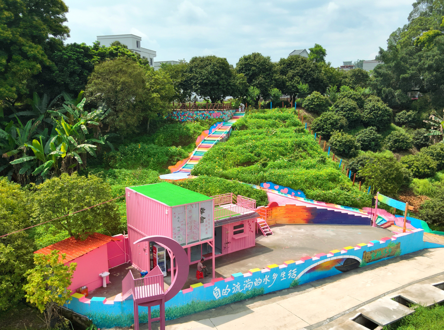 上引创意园项目位于肇庆市高要区南岸街道,通过改造闲置房屋、美化前门道路与花园,增设特色楼梯与广场墙绘,打造迎宾花园。园区引入咖啡、轻食等业态,在为市民游客提供新打卡场景的同时,也满足了餐饮消费需求,激活了社区空间活力。
