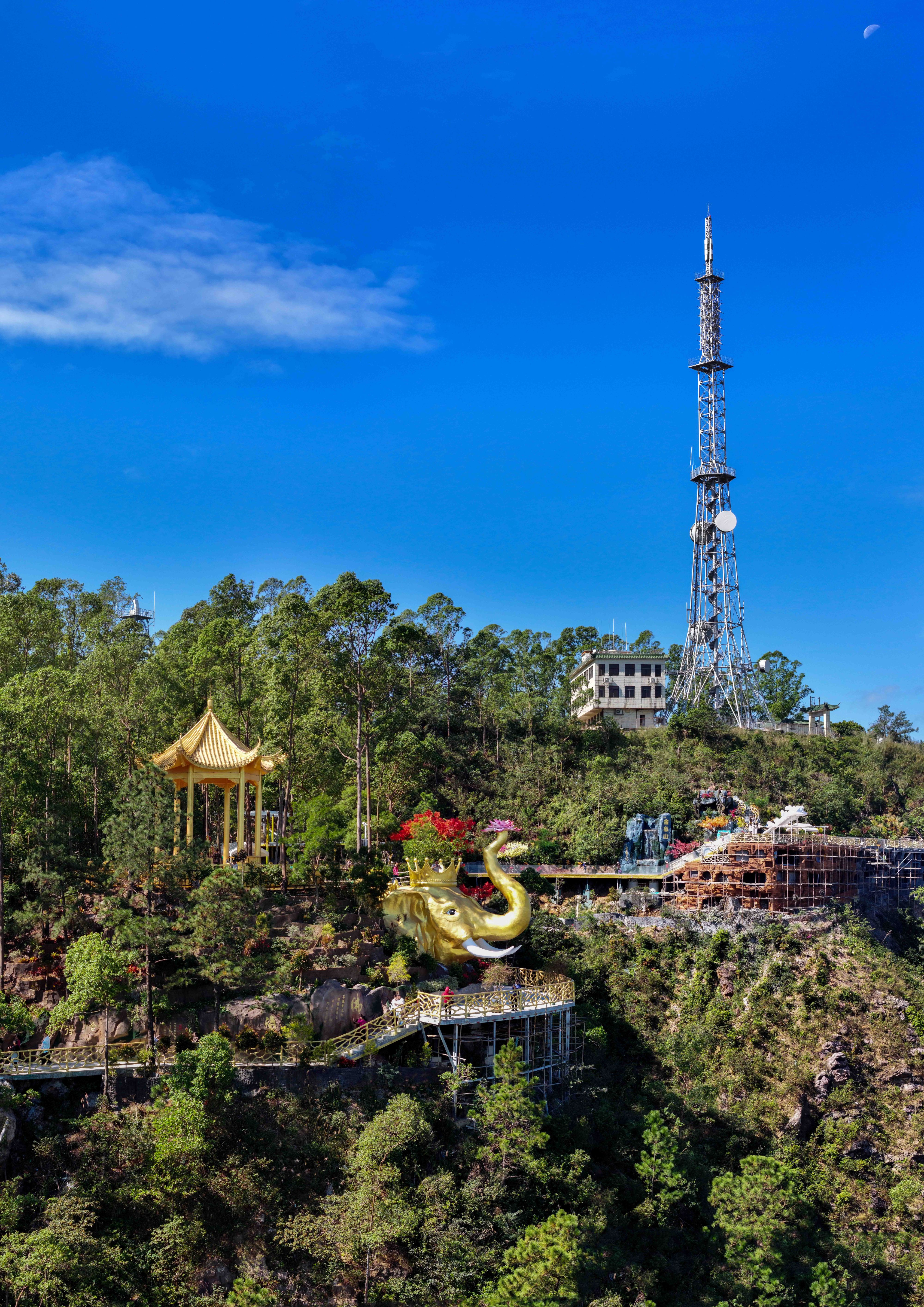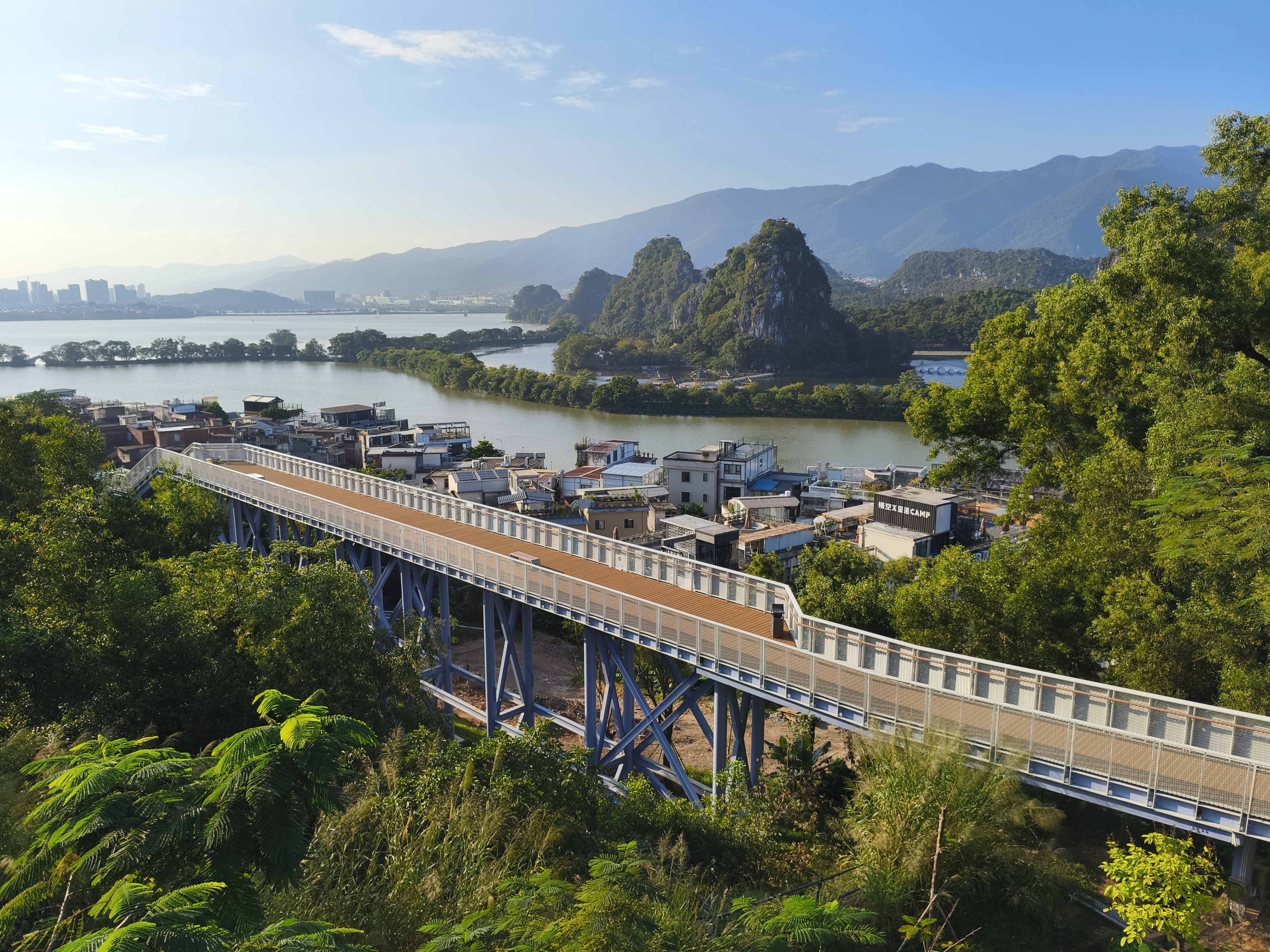全长1314米的岩前象岗云道步道,以架空设计轻触山体,提升游人观景视野,将七星岩秀丽风光尽收眼底。位于象岗顶部的“天空之镜”驿站作为社区制高点,其楼顶设有大型景观镜面,成为特色网红打卡地标;一旁的象岗驿站作为配套服务设施,共同构成山顶特色建筑群。