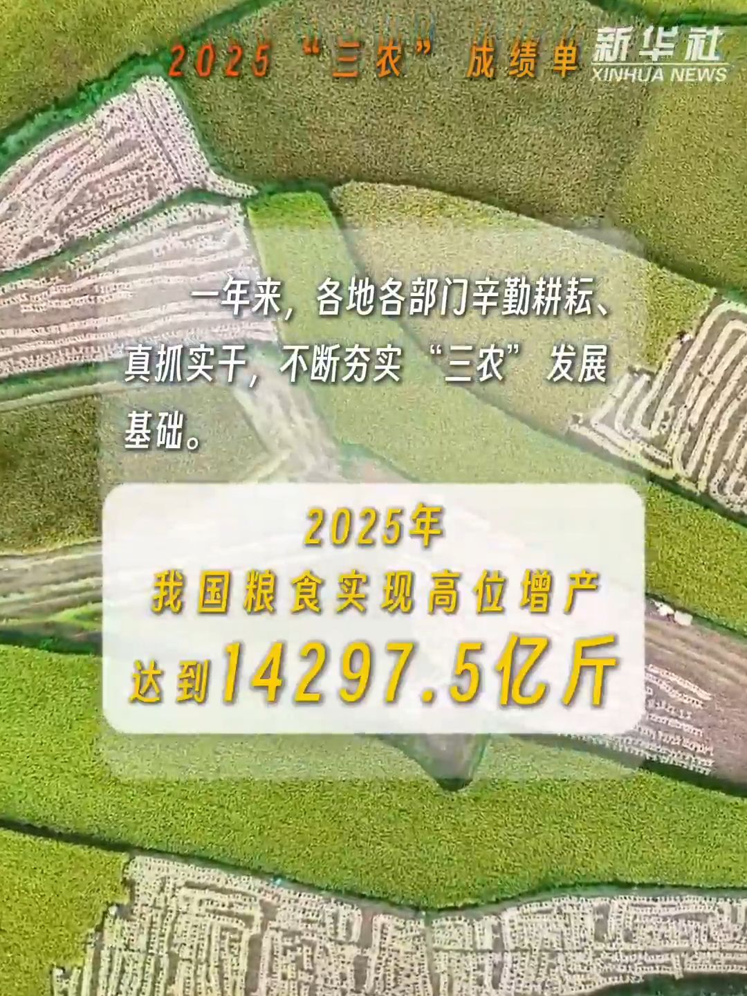 一年来,各地各部门辛勤耕耘、真抓实干,不断夯实“三农”发展基础。2025年,我国粮食实现高位增产,达到14297.5亿斤。