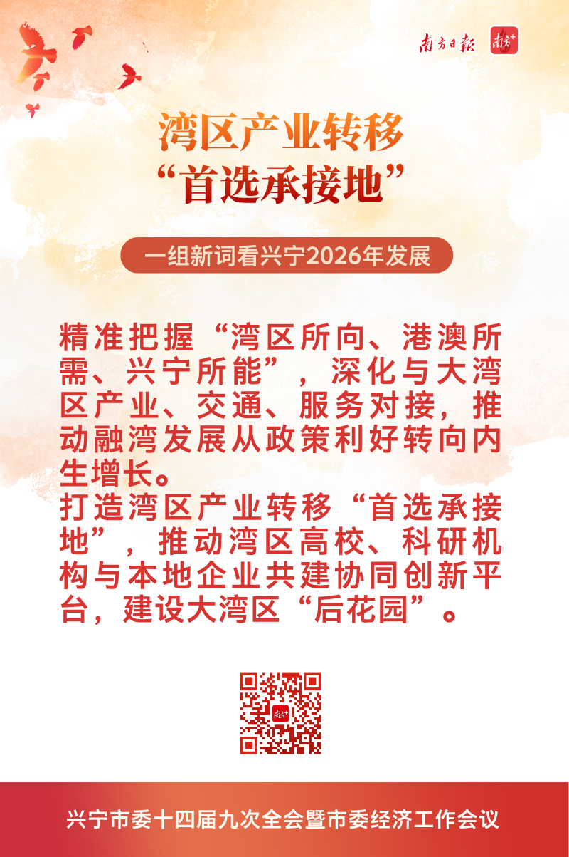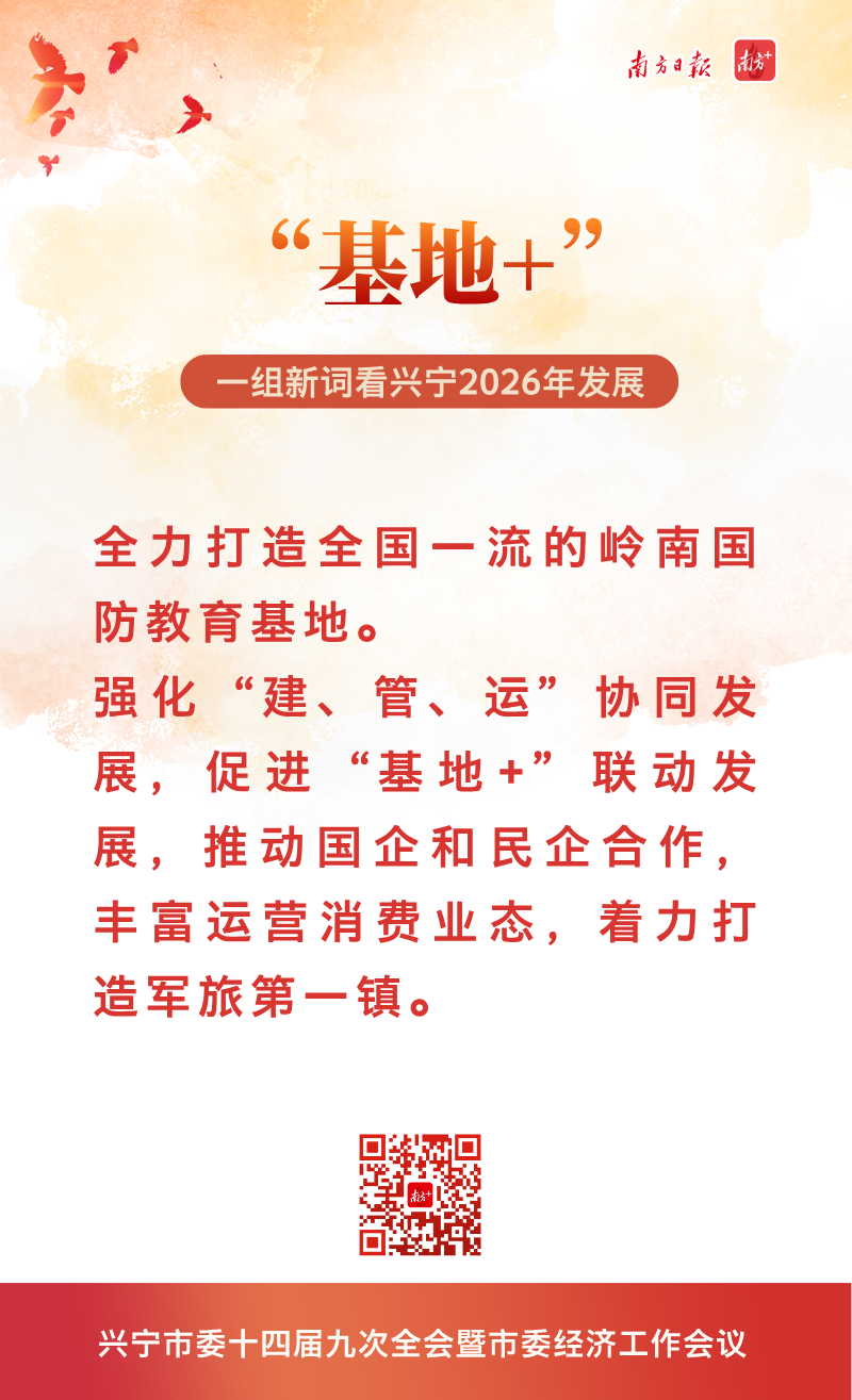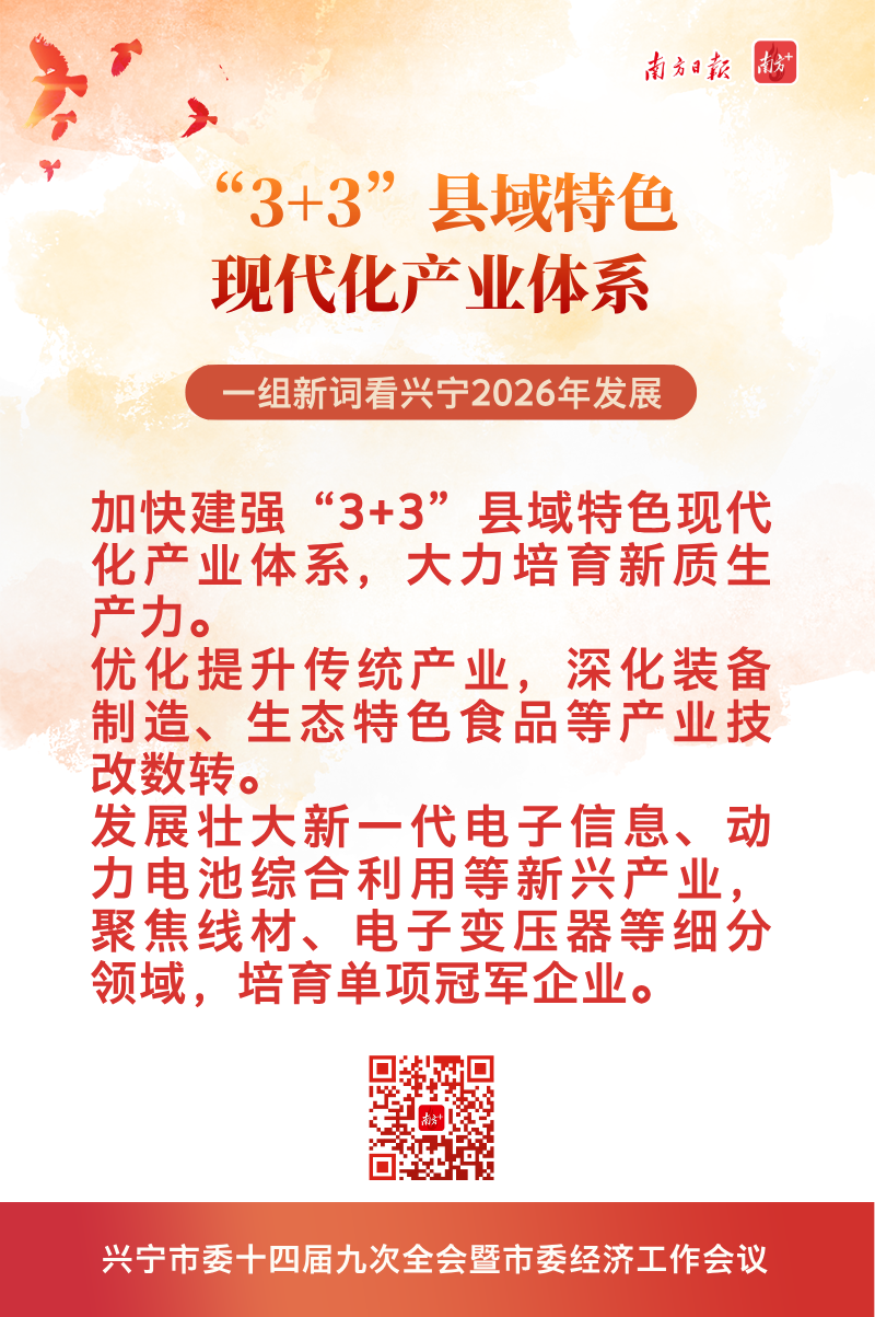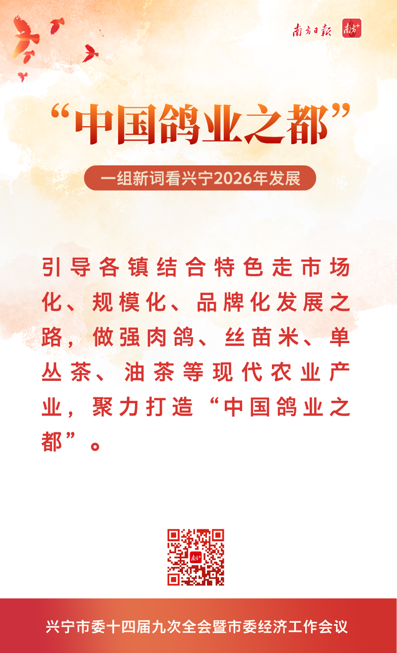 南方+摘录了十大新词,即“一立四强”“基地+”“一山、一河、一大道、四片区”空间发展布局、“3+3”县域特色现代化产业体系、湾区产业转移“首选承接地”、“中国鸽业之都”“第六产业”“古树立根苏区土、南药生金林生景”、新“兴宁八景”,一起来解读↓↓↓