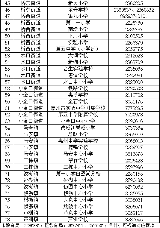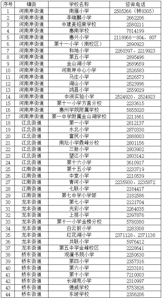 (七)惠城区中心区集体户籍由区教育局根据学位情况统筹安排,非惠城区中心区集体户籍由所属镇(街道)中心小学根据学位情况统筹安排,具体受理录入信息学校(非最终安排转入学校)安排如下: