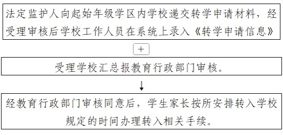 法定监护人凭规定的学生户口簿、房产证、学籍基本信息表等相关证件材料到起始年级所属学区学校申请转学,受理学校于规定时间内汇总上报教育行政部门审核,经教育行政主管部门审核通过后,学生家长按所安排转入学校规定的时间办理转入相关手续。