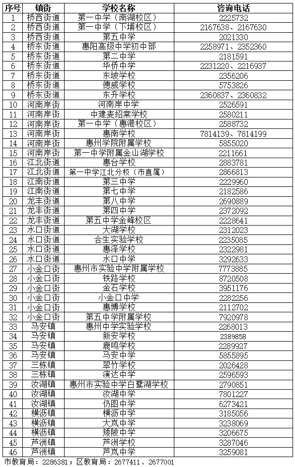 惠城区2026年春季学期公办初中招生咨询电话