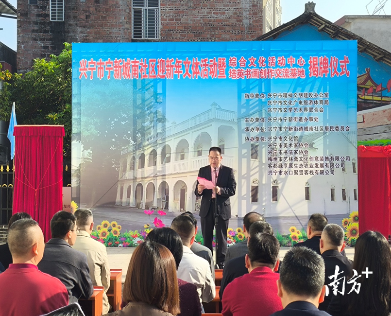 12月21日,兴宁宁新街道城南社区综合文化活动中心与培英书画创作交流基地正式揭牌启用。兴宁市政府、市政协、市人大常委会等单位相关领导,市美术家协会、书法家协会会员及艺术爱好者齐聚现场,共同见证这一文化惠民时刻。
