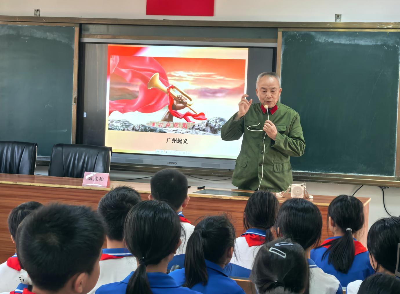 刘武松的授课之所以独具魅力,源于其“三重身份”的有机融合。这位曾获四次三等功的退役上校,既是经验丰富的老战士,又是长期从事宣传工作的老干部,同时还是出版过多部作品的市作协会员。在团结小学,他通过展示珍贵文献增强历史真实感;在新雅小学,他以军事专业视角剖析战役细节。这种融军人血性、宣传智慧和文学情怀于一体的讲述方式,使红色故事既有历史的厚重,又具时代的温度。