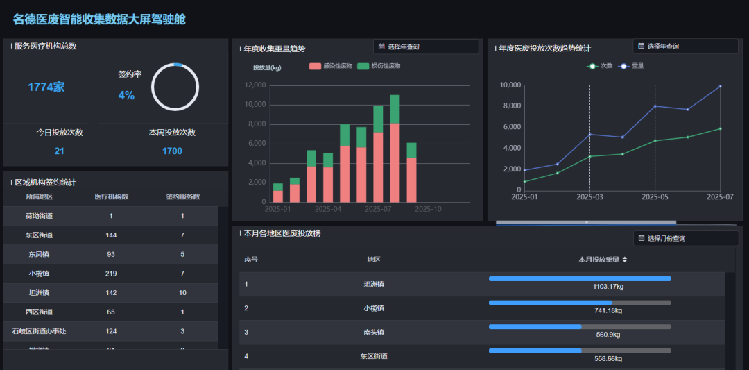 名城名德负责人表示:“我们借助平台的大数据分析功能,能够精准规划收运路线,提升车辆的调配效率。”借助平台数据支撑,名城名德进一步优化收运路线、提升作业车辆调配效率,使每个镇区作业时间缩短20分钟以上,显著降低时间与人力成本。同时,通过与市固废管理平台联动,打通“产生—运输—处置”全链条数据壁垒,实现医疗废物全程可溯源、可监管。截至目前,医疗单位均实现医废妥善交接,无一起监管漏洞事件,为城市公共卫生安全闭环管理提供了坚实支撑。