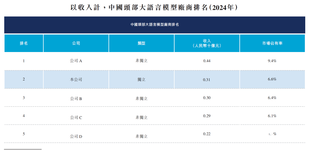 招股书显示,根据弗若斯特沙利文的资料,按2024年的收入计,智谱在中国独立通用大模型开发商中位列第一,在所有通用大模型开发商中位列第二,市场份额为6.6%,2024年收入为3.1亿。其中第一名市场份额为9.4%,2024年收入为4.4亿。
