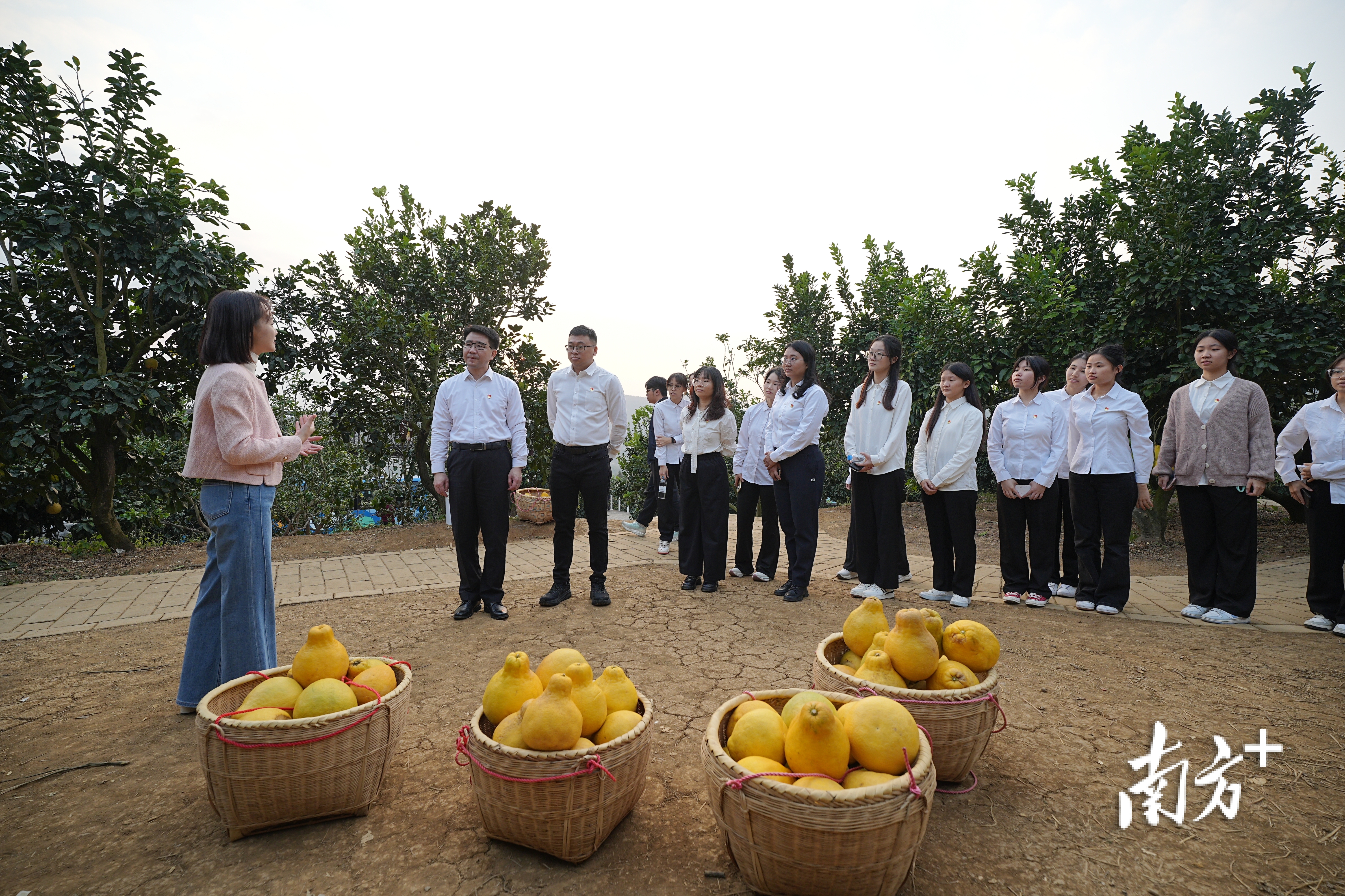 全体党员还前往梅县区雁洋镇南福金柚种植基地调研。该基地是当地推动乡村振兴、发展特色农业的示范点。党员们深入田间地头,与种植户交流,了解金柚产业如何通过技术创新和品牌建设带动农民增收。外国语学院学生第一党支部书记钟凤仪表示,作为外国语学院师生,未来要发挥语言优势,助力农产品“走出去”。