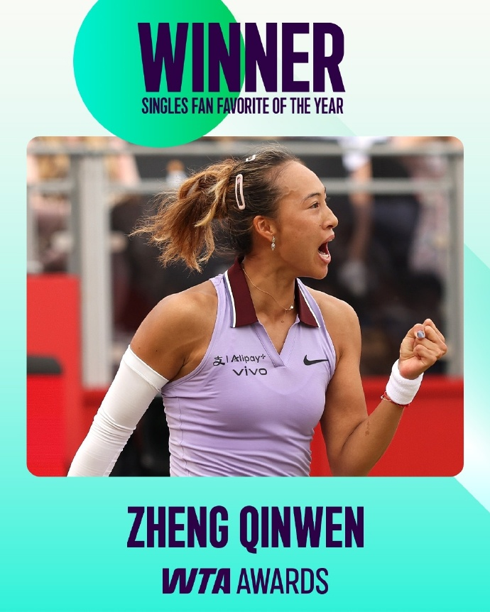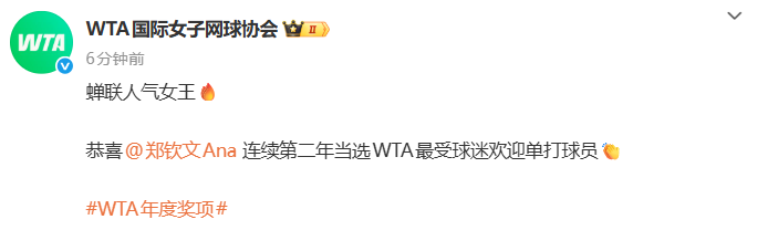 12月15日,据@WTA国际女子网球协会,郑钦文连续第二年当选WTA最受球迷欢迎单打球员。
