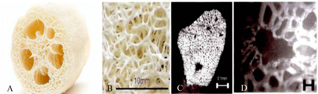 丝瓜络的宏观结构(图A)与纤维的微观结构(图B,C,D)(图片来源:参考文献[1])