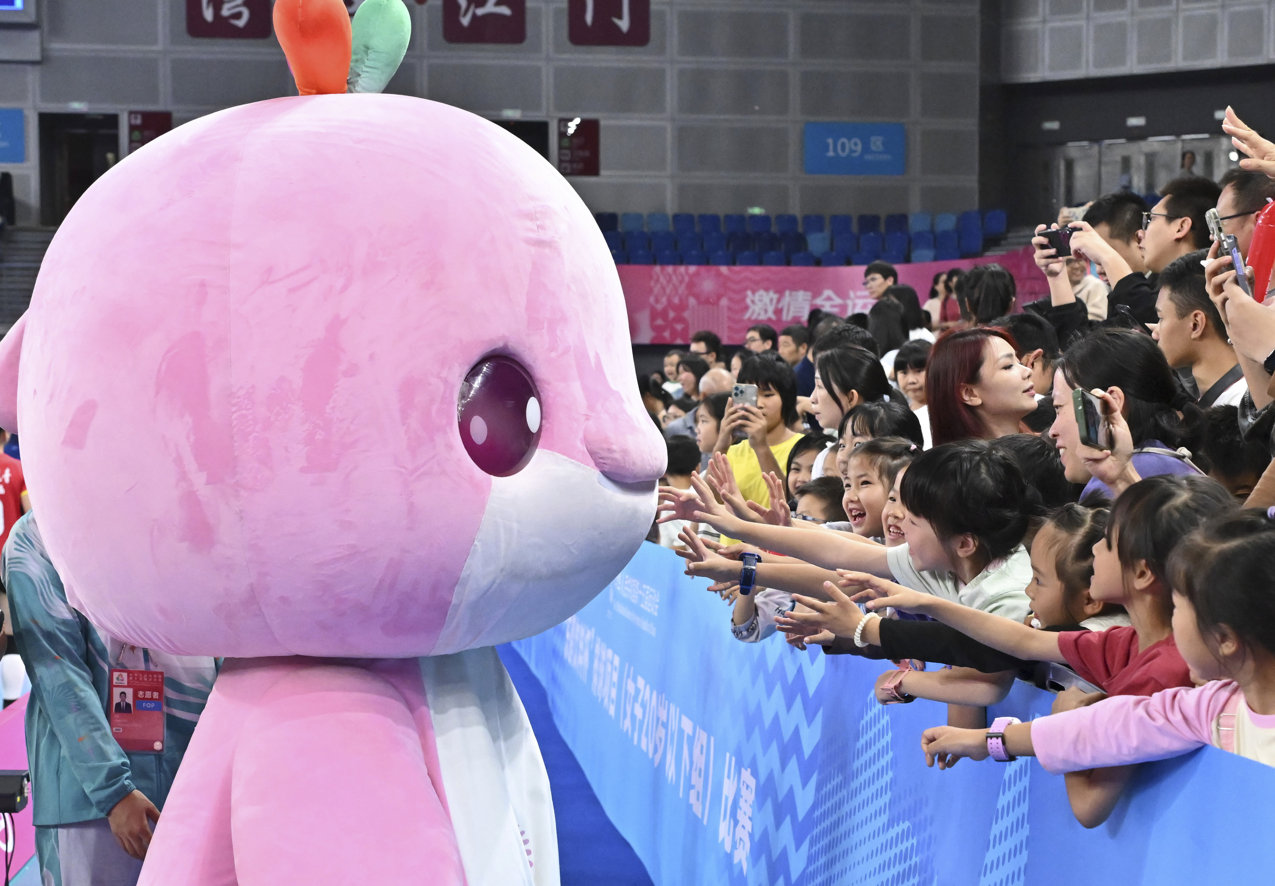 吉祥物“乐融融”赛后与观众互动。新华社发 南方+ 张由琼 拍摄