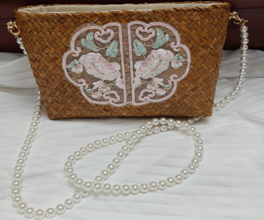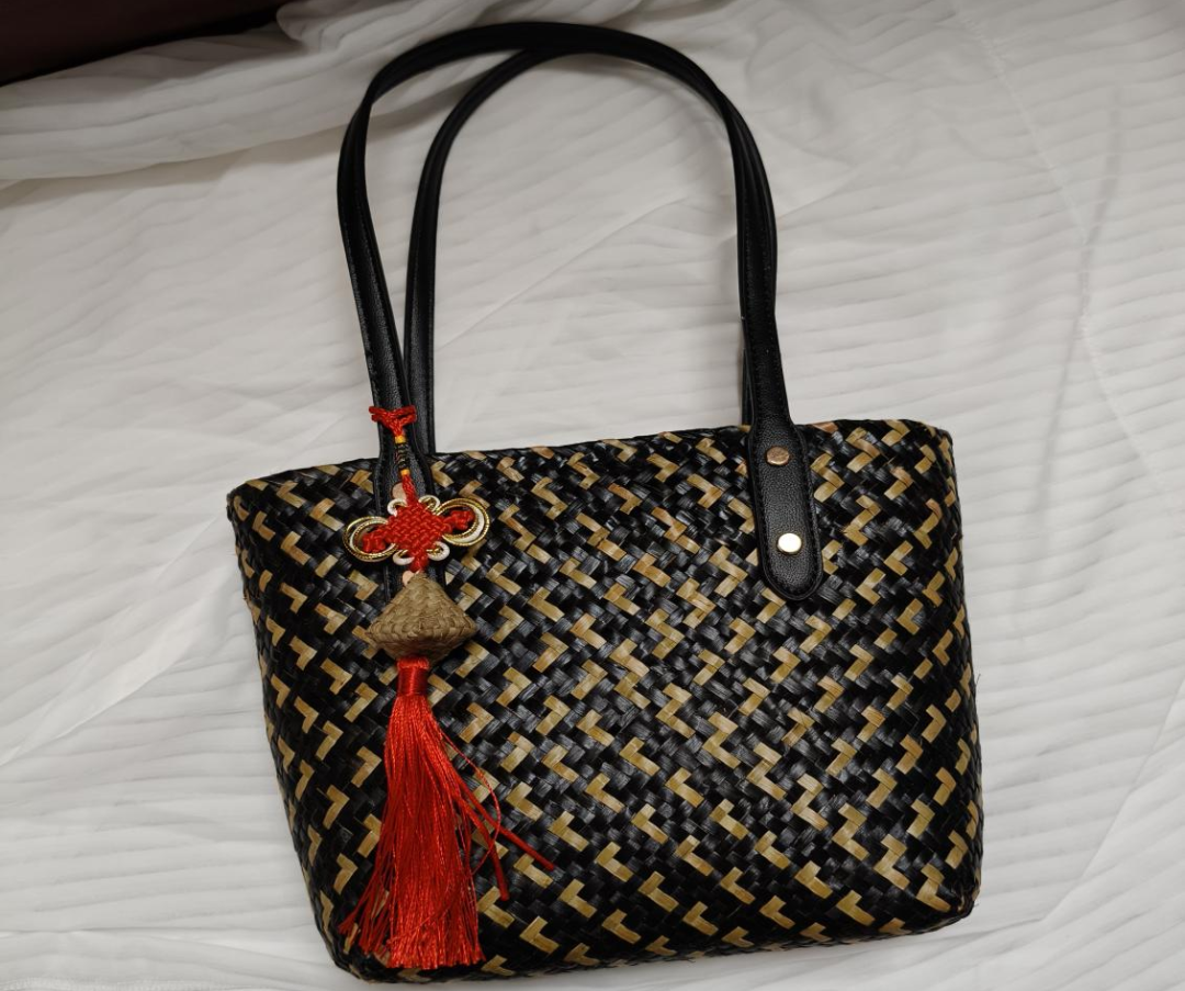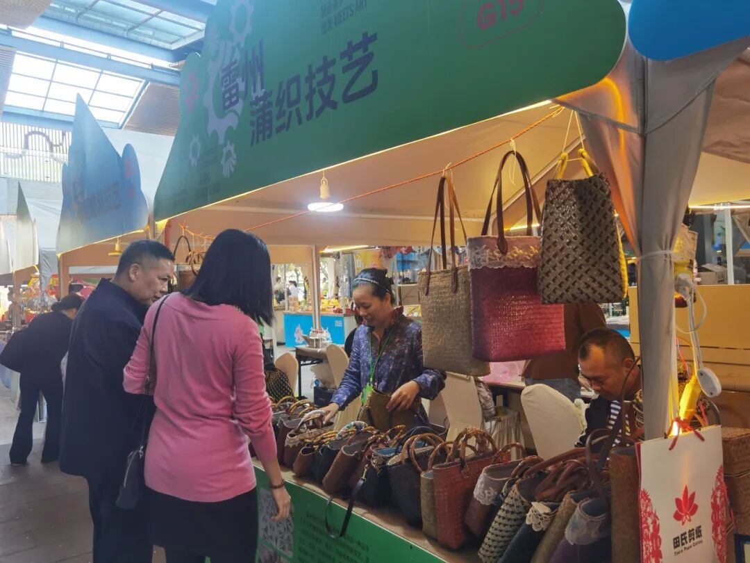展架上挂满了编织精巧、配色典雅的手提包,从质朴的棕黑到时尚的混色,每一件作品都凝结着传统手工艺的智慧与匠心,吸引众多参观者驻足欣赏、询价。