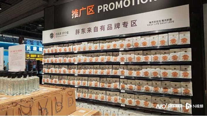 南都记者走访看到,进入超市后迎面便是整整两排胖东来自有品牌专区货架,十分醒目。而在永辉自有品牌商品方面,南沙万达店则摆出了“全明星阵容”,包括烘焙蛋糕、“永辉优选”自有品牌果汁、黑松露饼干等。其中,永辉自有的烘焙品牌——YH Bakery的榴莲千层蛋糕是北京、福州、遵义等部分调改店开业阶段的单品销冠;“永辉优选”黑松露饼干在沈阳沈北吾悦广场店开业时两天售罄。