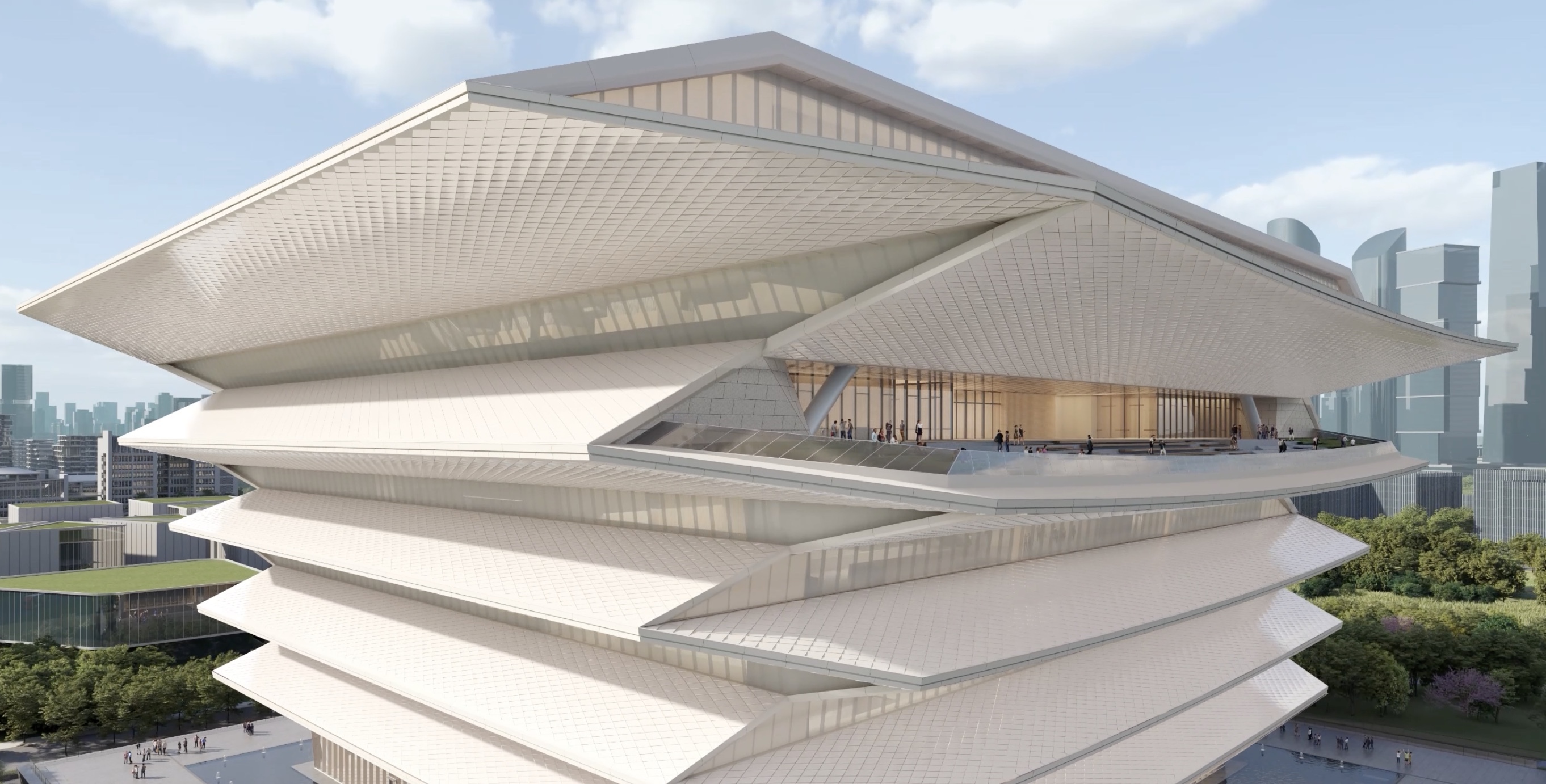 “从远处看,由下至上的五层重檐形成了逐层出挑、不断升腾的形象,整个建筑造型就像一盏被拉开的灯笼,兼具中国传统元素与现代建筑美学。”华南理工大学建筑设计研究院何镜堂创作院副院长,前海博物馆副总建筑师张振辉介绍。