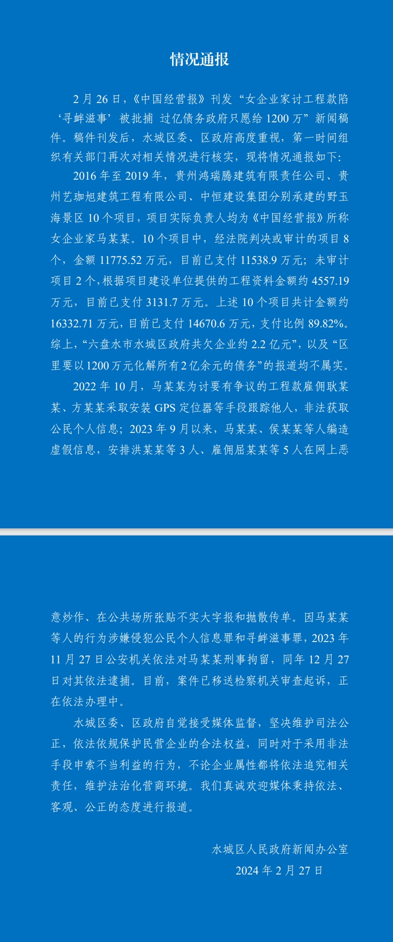 2024年2月27日,针对媒体报道“贵州女企业家讨工程款陷‘寻衅滋事’被批捕,过亿债务政府只愿给1200万元”一事,贵州省六盘水市水城区人民政府新闻办公室发布情况通报。