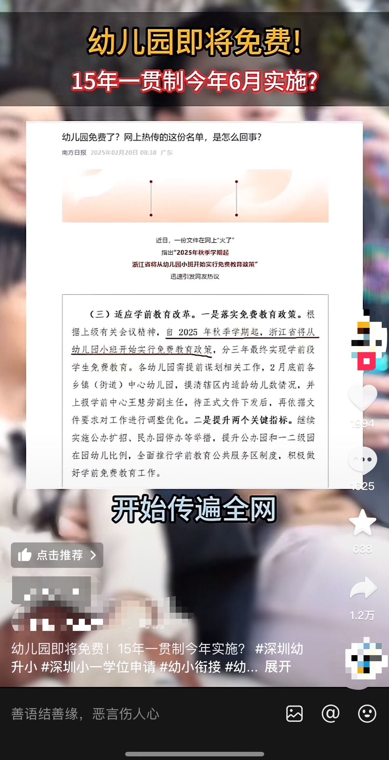 2月20日,红星新闻记者从抖音等短视频平台上看到,有部分博主发布了“幼儿园开始免费上”“幼儿园免费试点公布了”等文字内容,并配图了一份“免费试点地区名单”。在视频下方有很多网友留言表示关注,有人称自己刚刚给孩子交完幼儿园学费,并没有免费,还有人遗憾这份名单中没有列入自己孩子所在的地区。
