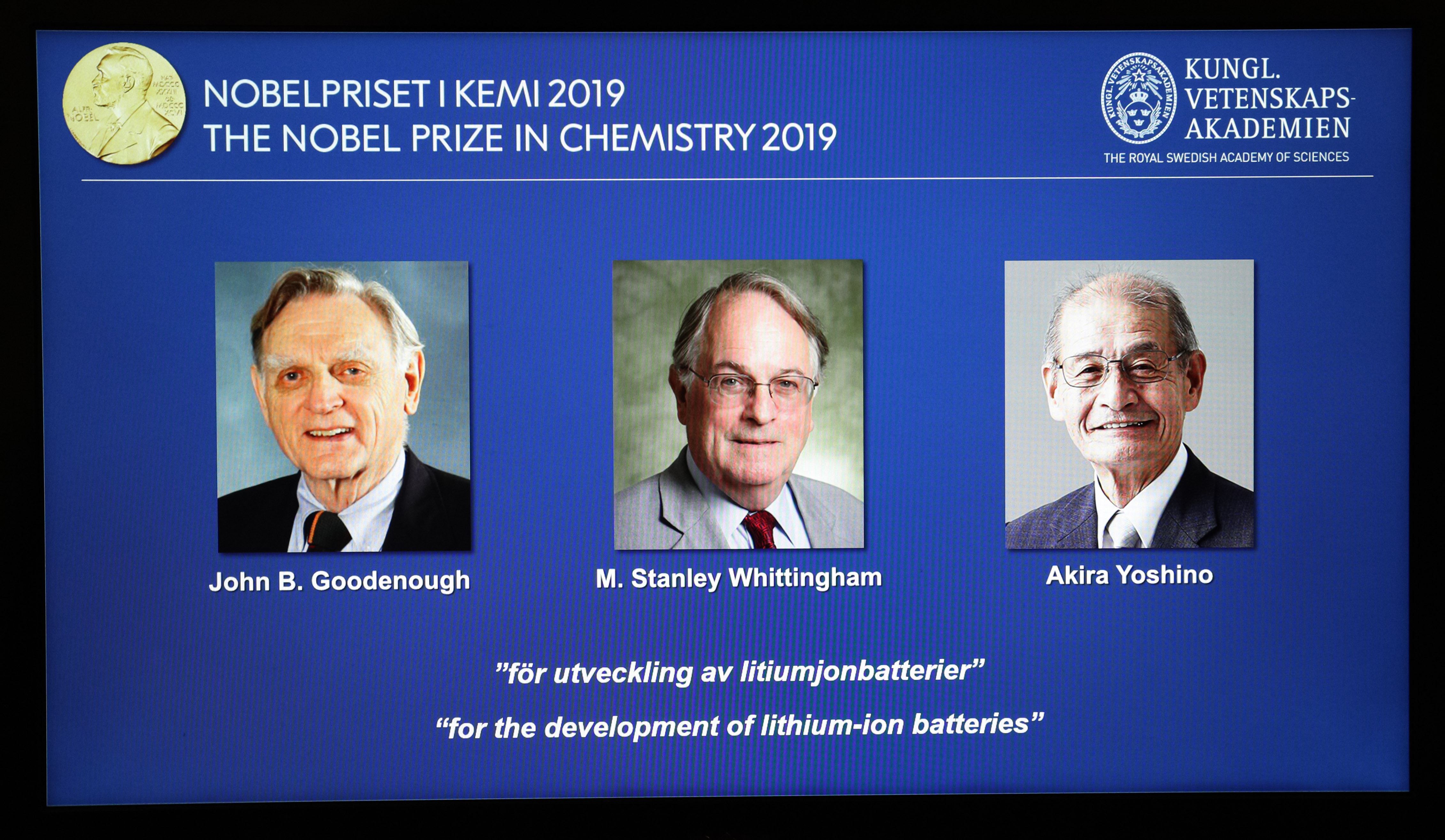 当地时间2019年10月9日,瑞典皇家科学院将2019年诺贝尔化学奖授予约翰·古迪纳夫、斯坦利·惠廷厄姆和吉野彰,以表彰他们在锂电池发展上所做的贡献。图源:新华社
