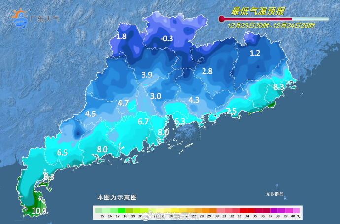 👉24日,全省晴到多云。最低气温:粤北市县0~3℃,高寒山区-5℃~0℃;珠江三角洲中北部市县3~6℃,南部沿海市县8~11℃,其余市县6~8℃,粤北和珠江三角洲北部市县有冰(霜)冻。