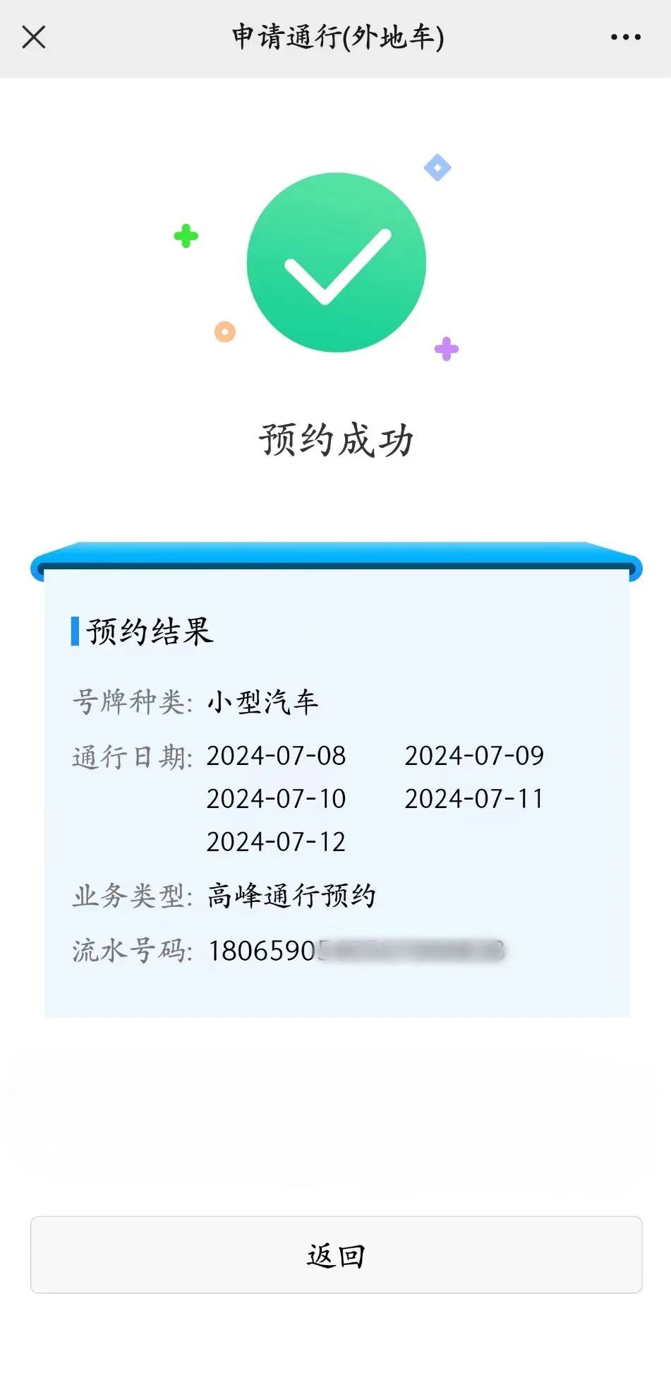 申请通行:进入申请通行页面,输入正确的号牌种类、号牌号码、车辆识别代码后四位、发动机号后六位,车主姓名等信息后,选择通行日期,点击提交按钮,确认输入信息无误后点击提交按钮,系统提示申请成功。