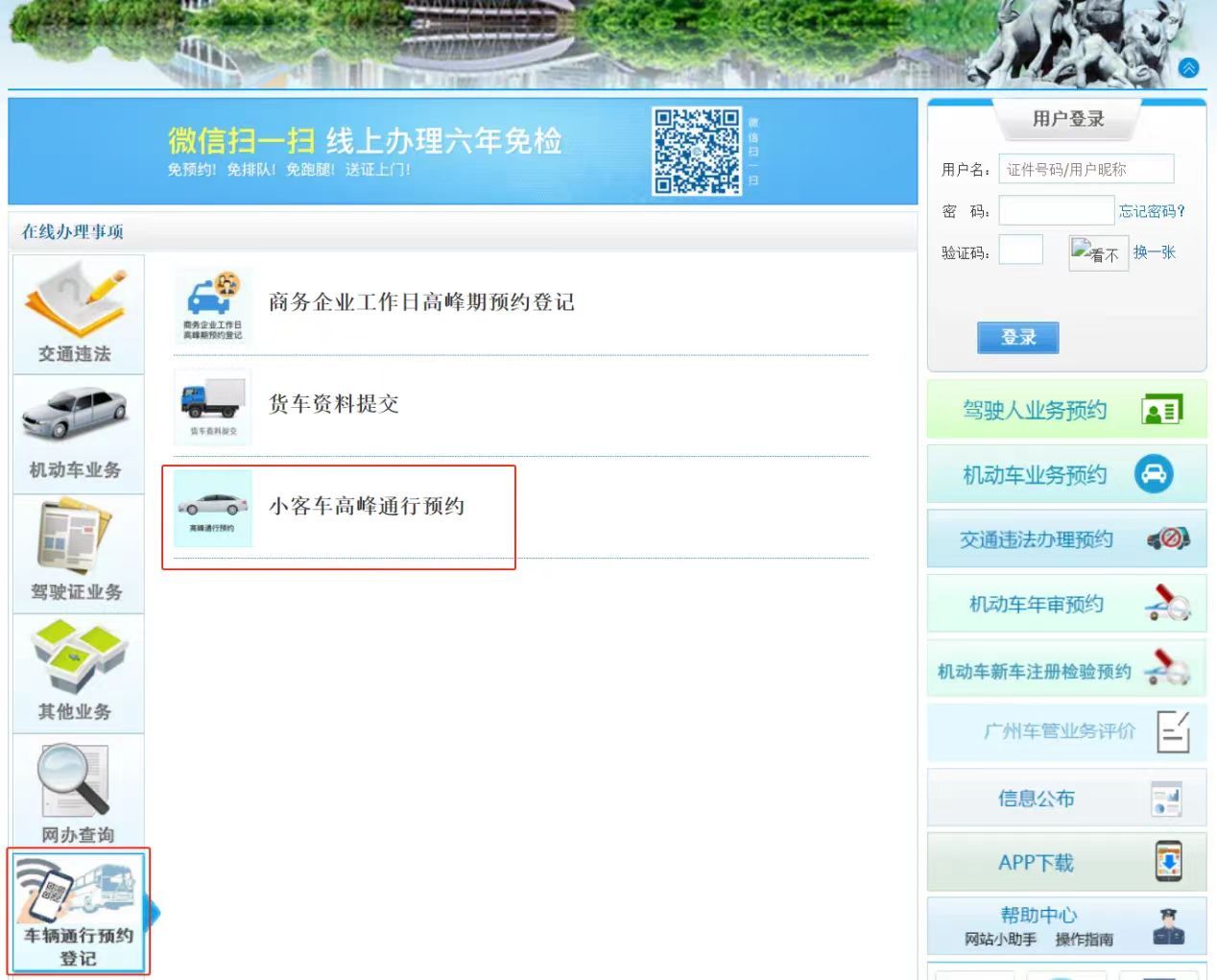 登录广州市公安局门户网站(https://cgsqy.gzjd.gov.cn/cgs/html/hall/index.html ),进入网上车管所页面,点击车辆通行预约登记,点击小客车高峰通行预约,进入申请页面。