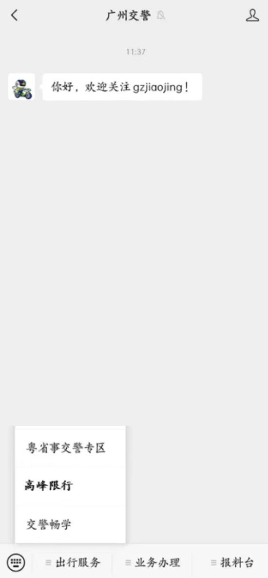 登录:关注“广州交警”微信公众号,进入公众号,点击出行服务—高峰限行,进入页面。