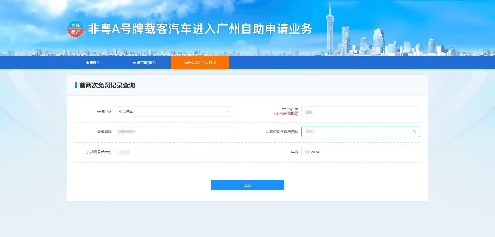 前两次免罚记录查询:进入查询页面,输入号牌种类、车主姓名、号牌号码、车辆识别码后四位、发动机号后六位、年度,可查询到对应号牌在对应年度前两次高峰限行免罚记录。该功能会按年度显示对应车辆前两次高峰限行免罚记录。
