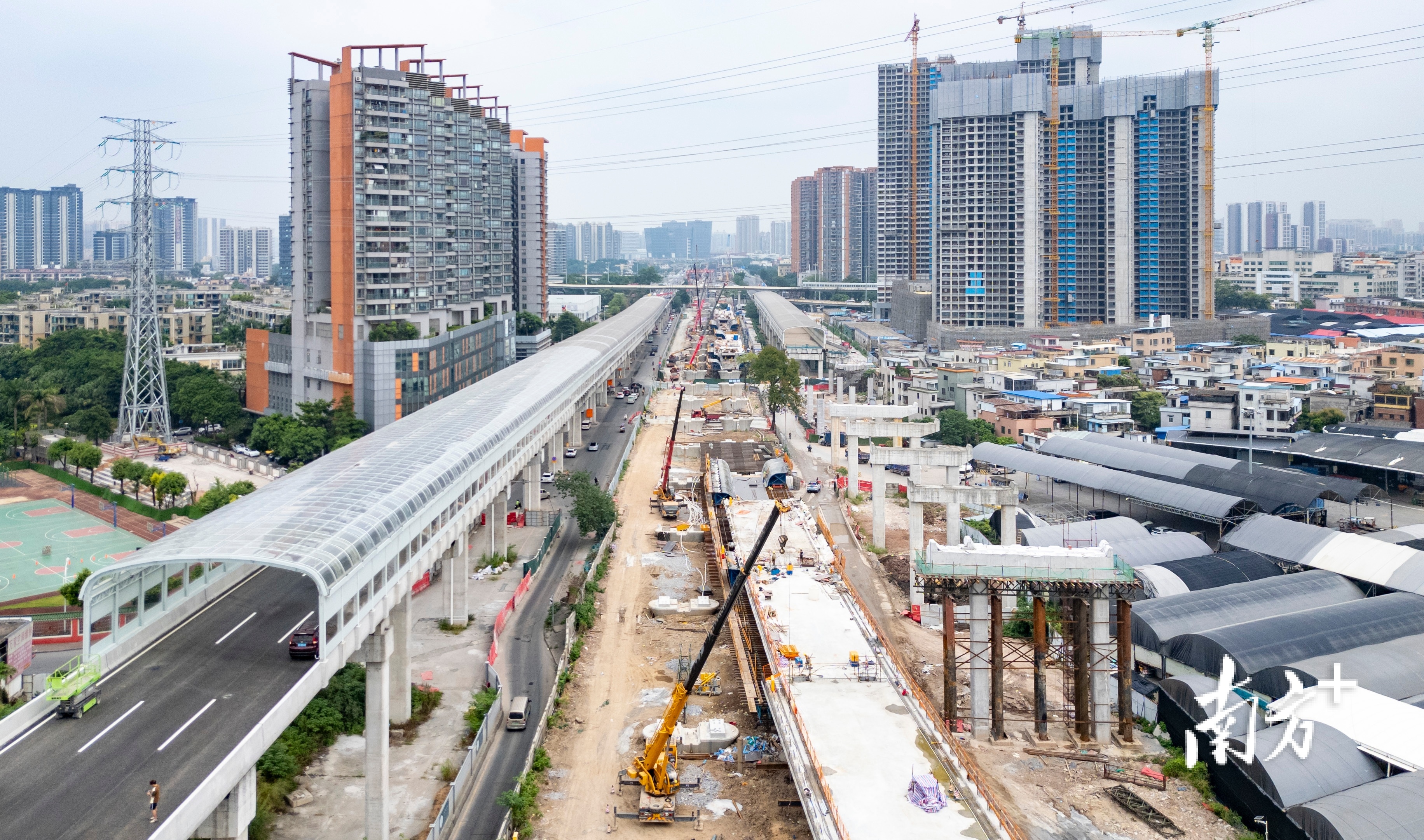 在多方共同努力下,项目不断迎来施工关键节点,接连取得重大进展突破。2023年11月26日,电塔开始升塔施工,仅18天就顺利完成广州段、南海段220kV输电线路迁改任务及验收工作;2024年5月2日凌晨,伴随着一声“吊装开始”的号令,150吨级起重架桥机启动运行,将100吨的预制箱梁缓缓提起,并架设至指定的盖梁上,192个小时后,全部预制箱梁起重吊装施工任务圆满完成,顺利实现与佛山南海段桥梁主体结构贯通的关键节点目标;2024年8月30日,在广州市交通运输局的督导下,建设团队顺利完成A线高架桥沥青摊铺施工,为高架桥完工通车打下坚实基础。