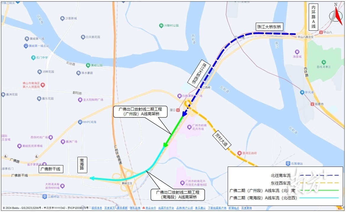 “A线高架桥开通前,内环路广佛出口前往广佛新干线需绕行广佛路或通过芳兴路等支路通行,早晚高峰较为拥堵,用时约半小时。开通后,从内环路广佛出口出发、经广佛一期广佛二期到广佛新干线的车程可以缩短到5分钟左右。”广州市中心区交通项目管理中心项目负责人张宝湖介绍道。