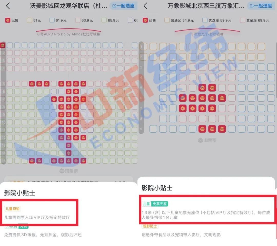 如万象影城北京西三旗万象汇店在购票提示中称,1.3米(含)以下儿童免票无座位(不包括VIP厅及指定特效厅),每位成人最多携带1名儿童;万达影城北京乐多港万达广场店在购票提示中表示,除PRIME厅外,普通2D、3D影片,1.3米(含)以下儿童可在成人陪同下免费观看,一名成人限带一名儿童,儿童不提供座位;沃美影城北京回龙观华联店则提示,VIP厅及指定特效厅儿童需购票入场,其余影厅1.3米(含)以下儿童免票无座位,每位成人最多携带1名儿童(3D半价)。