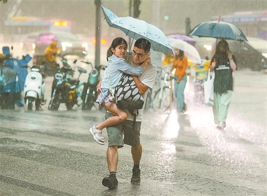 20日午后,广州遭遇强降水,大人抱着孩子撑伞前行。图/羊城晚报记者 梁怿韬
