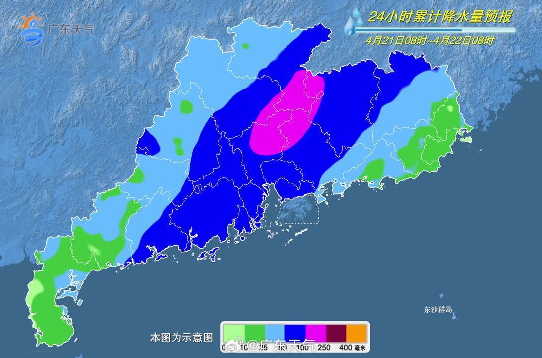 @广东天气 预计,21日-22日粤北、珠江三角洲仍有连续暴雨过程,雷雨时局地伴有6~8级短时大风和小冰雹;23日,降水强度明显减弱。未来一周强降水频繁,累积雨量大,具有极端性,致灾风险高,同时需注意广西、江西、湖南、福建等上游来水对广东省的叠加影响,并注意防御强降水及其引发的城乡积涝、山洪、泥石流、山体滑坡和流域性洪水等灾害。