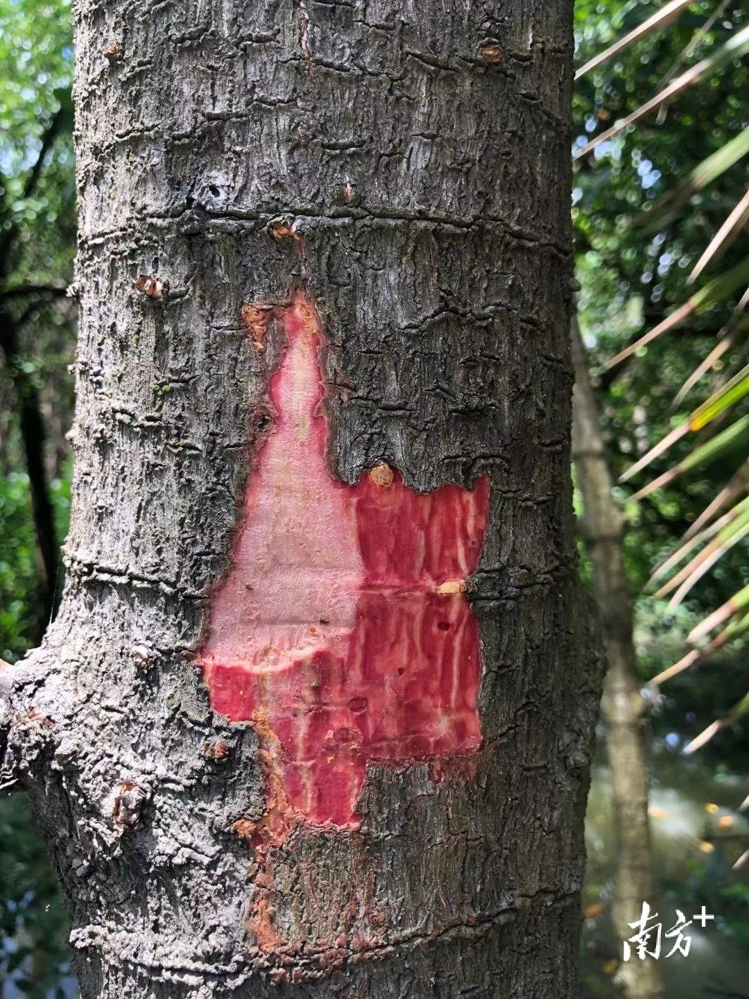 红树植物树皮中的单宁遇空气后氧化变红色。