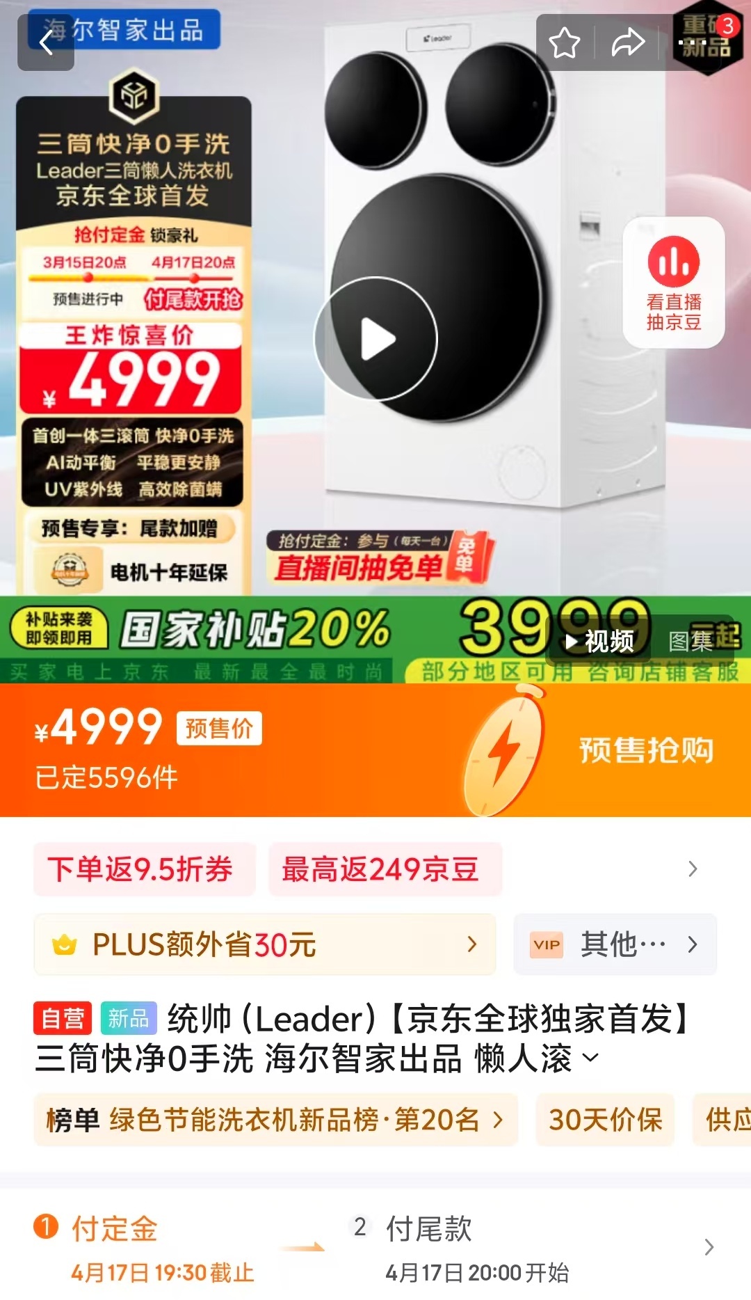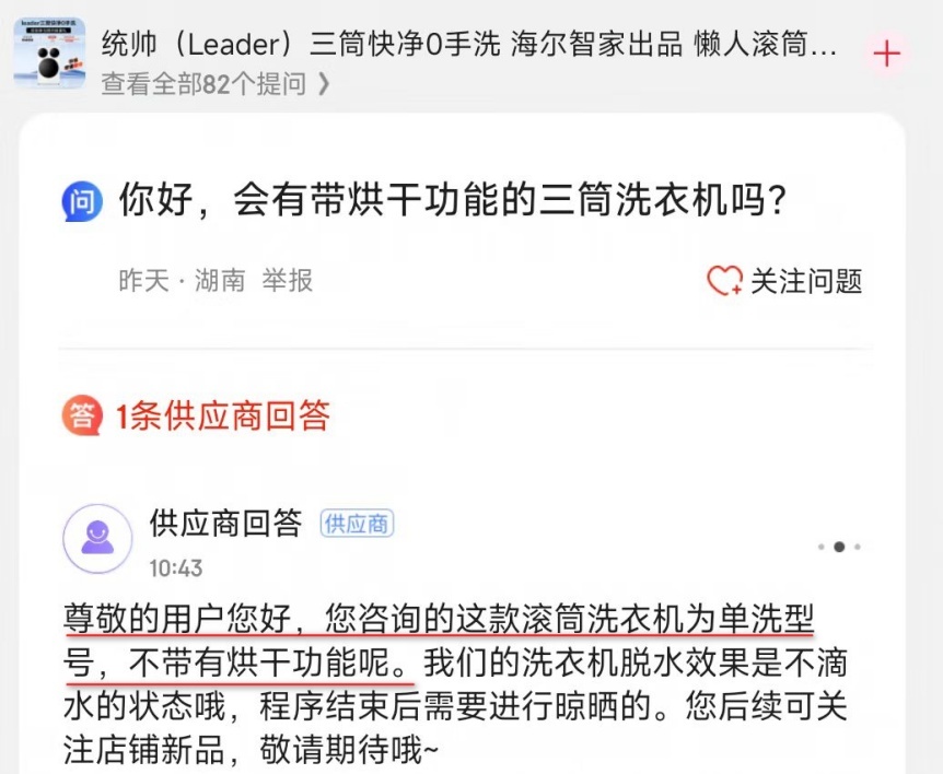 从价格与性价比来说,海尔京东定价4999元,国补后可到3999元起,在同价位的洗衣机里,相当于用一筒价格买三筒。但由于还在预售阶段,无法看到用户的真实评价,不过这款三筒洗衣机是不带烘干功能的,直接痛失部分广东用户。