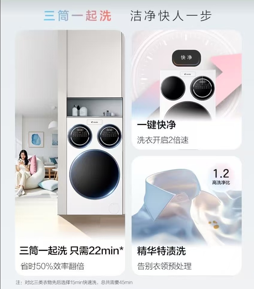 从筒数来看,海尔三筒真正实现了网友的设想,支持 主筒(大件)+ 副筒 1(内衣)+ 副筒 2(袜子 / 小件)同时洗,22 分钟完成全部分类,彻底解决内衣、 袜子手洗的痛苦。