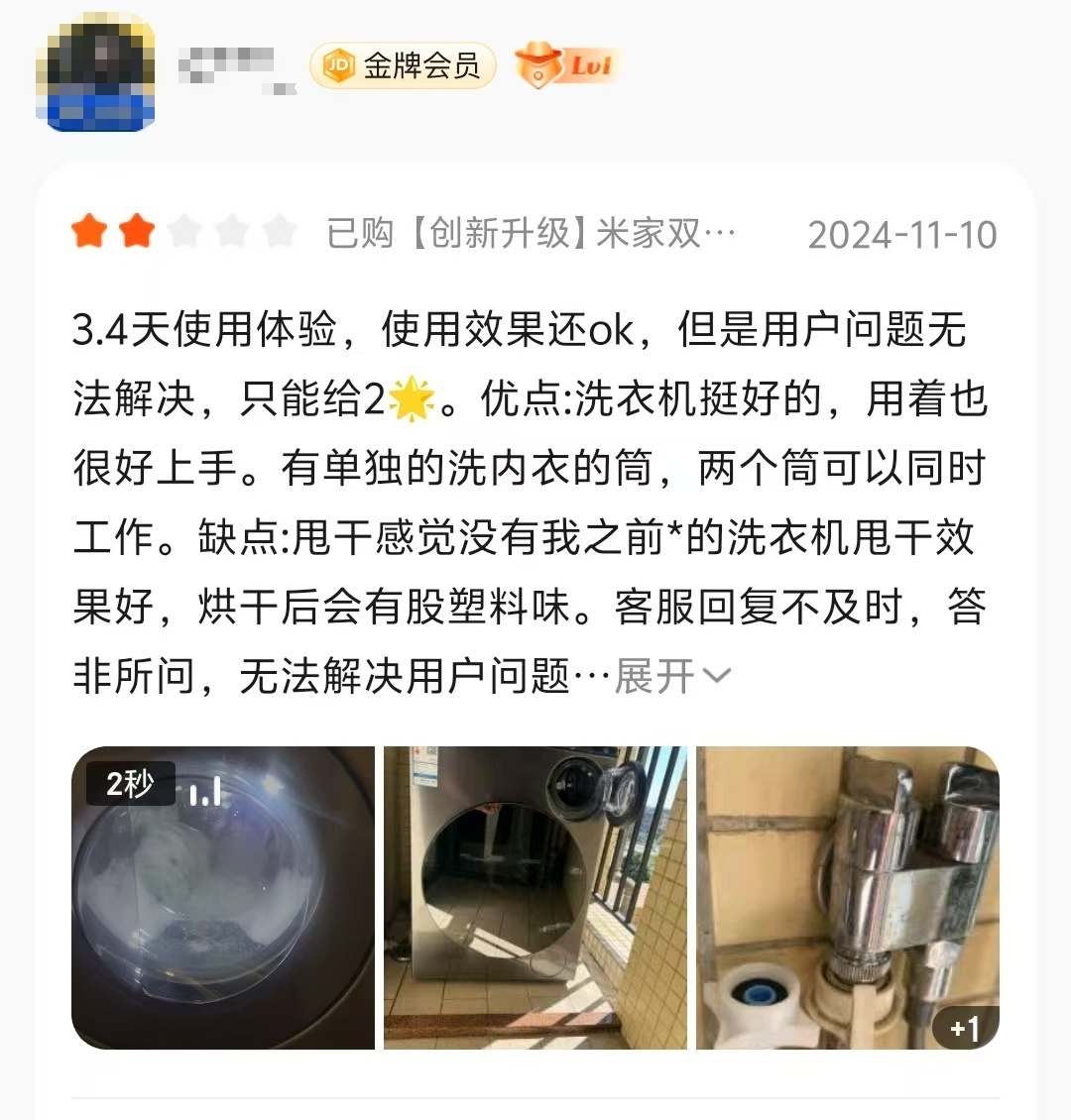 而小米同样是售价4999元,却只能买到双筒,但小米的双筒洗衣机是自带烘干功能的。小米双筒洗衣机已经在售,好评有许多,但也有用户吐槽其小筒容量太小了,3条内裤会很挤;烘干时长太长,烘不干还有水甩不干等问题。