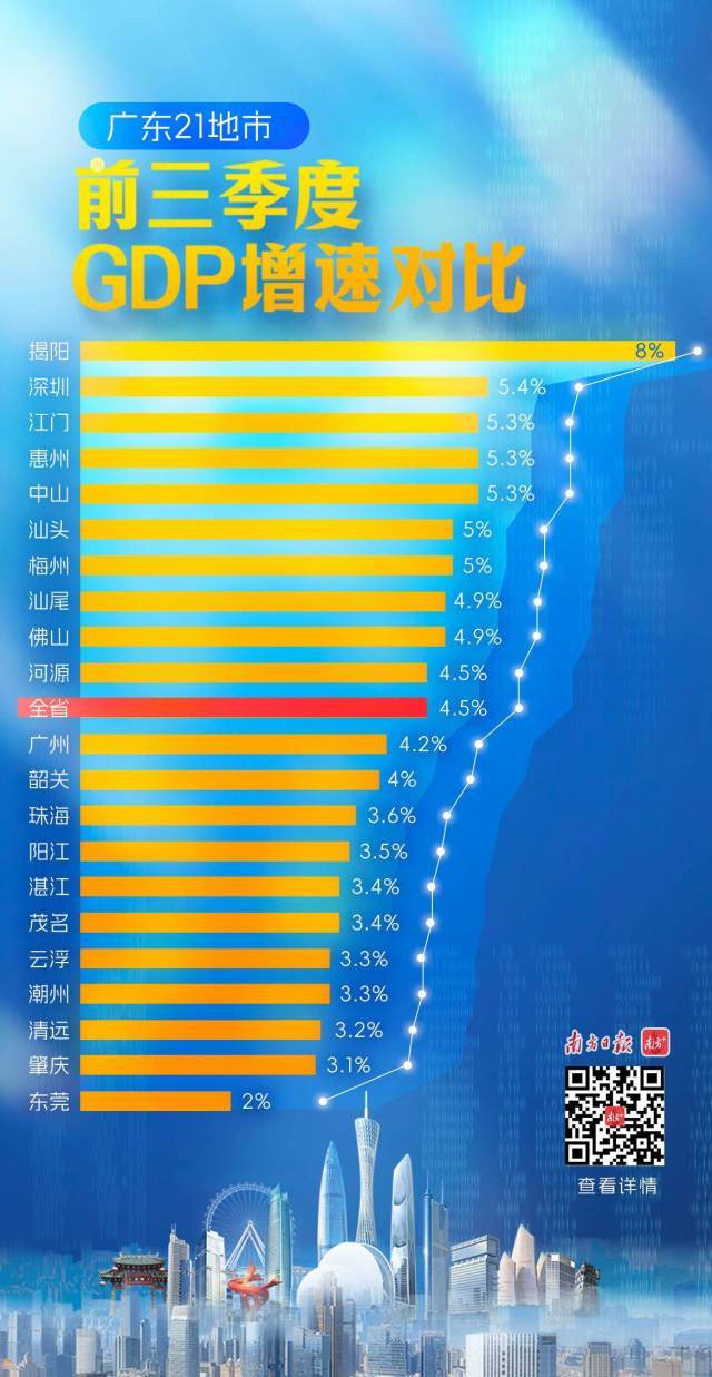 不久前,广东发布前三季度经济数据,全省GDP增长4.5%;截至10月31日,全省21地市前三季度经济数据也已全部出炉。